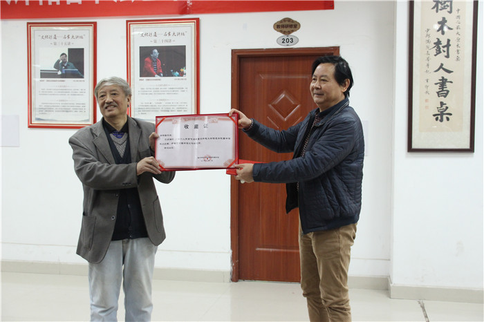 捐赠仪式上,邓阳春先生说道:“今天,我对各位老师及学生的到来表示感谢。今年6月我在磁器口举办了‘我爱重庆·邓阳春诗歌书法展’,重庆是我的第三故乡,我非常热爱重庆,因为我对它的热爱,所以才诞生了这些书法作品。重庆邮电大学移通学院作为一所工科院校,对文化艺术的重视、包容接纳态度展现了别样的人文情怀。移通学院对文化如此重视,树立文化自信,是响应国家的号召。移通学院能够接受我的作品,在此我深表感谢。”随后,邓先生把自己的20幅书法作品捐赠给移通学院,张德民院长为他颁发《收藏证》和聘书。