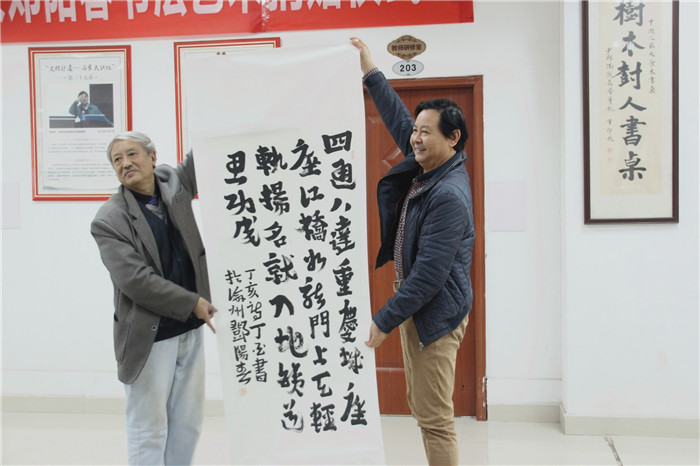 张院长代表学校对邓阳春先生表示感谢,他说:“今天,我非常荣幸地能够参加邓阳春先生的书法艺术捐赠仪式,在此我代表学校聘请邓先生作为我校“名誉图书馆研究馆员”,其书法作品将会永远保存在移通的图书馆里。虽然移通是一所工科学校,但是学校很重视培养学生的人文素质,通过各种教育教学方式把学生培养成有文化底蕴的‘完整的人’,相信有了书法作品的熏陶,将会更好地帮助师生们。我们也希望邓先生多来学校参观交流,与学生进行书法艺术等方面的沟通与指导。”