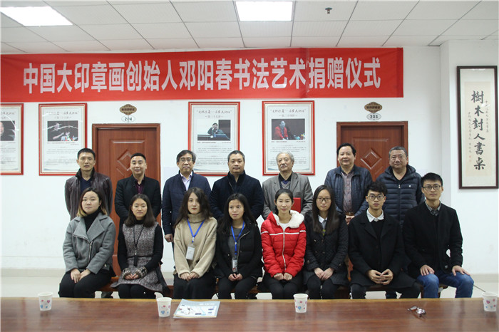 12月1日上午11点,中国大印章画创始人邓阳春书法艺术捐赠仪式在图书馆二楼隆重举行,邓阳春先生向我校图书馆捐赠了20副书法作品。院长张德民教授、副院长尹邦满博士、院领导周德才、图书馆馆长秦代辉出席捐赠仪式,图书馆老师及学生参加仪式。