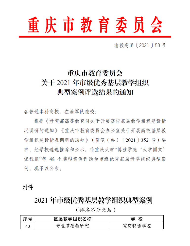 近日,重庆市教委下发了《重庆教育委员会关于2021年市级优秀基层教学组织典型案例评选结果的通知》(渝教高函〔2021〕53号),我校通信与信息工程学院专业基础教研室成功获评为市级优秀基层教学组织典型案例。
