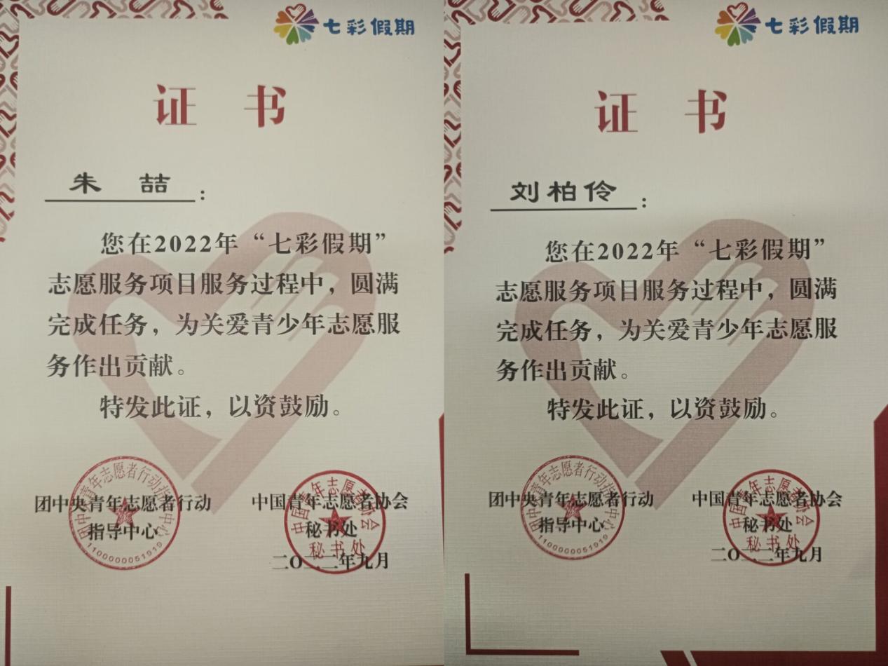 “您在2022年‘七彩假期’志愿服务项目服务过程中,圆满完成任务,为关爱青少年志愿服务作出贡献,特发此证,以资鼓励。”