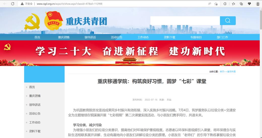我校筑梦服务队于7月入驻合川区铜溪镇铜溪社区开展志愿服务活动。由19位成员紧跟团中央指示利用自身专业知识结合小朋友特点开展系列活动,用行动践行志愿服务精神。活动期间开展“七彩假期”主题课堂7期,团队累计志愿时长500余小时,共受益人数600余人次,投放相关稿件到校内外媒体宣传平台共计40余次,累计阅读量上万次,其中不乏中国青年网、中国新闻网、重庆共青团、中国公益报道等国家级、省市级媒体平台。