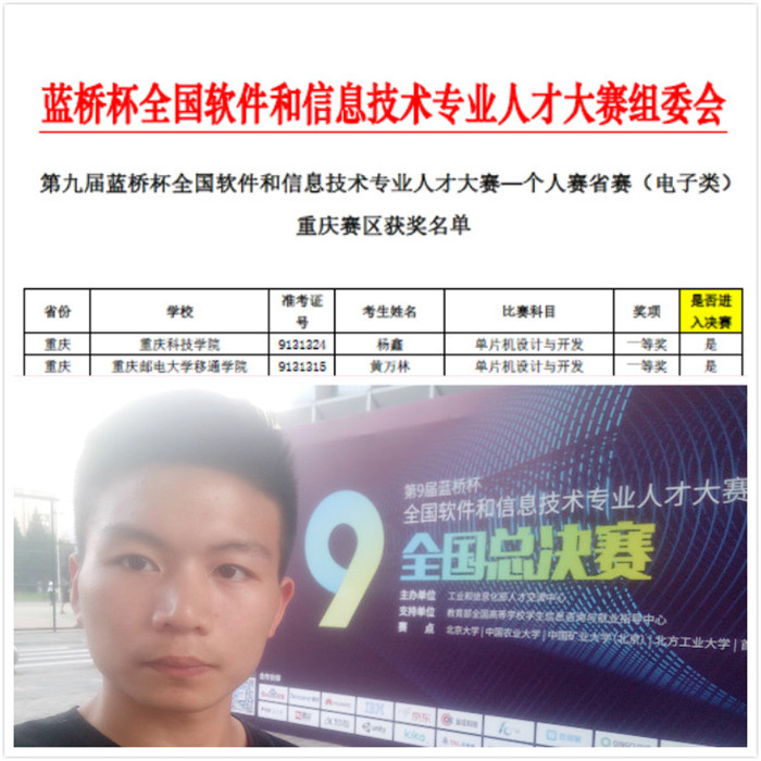 5月26日,第九届“蓝桥杯”全国软件和信息技术专业人才大赛总决赛在北京拉开序幕,来自全国高校的4000多名计算机、软件、电子信息专业选手展开激烈角逐。在通信与物联网工程学院王强老师指导下,我校学生黄万林不负众望,发挥出色,荣获单片机设计与开发组三等奖,这是重庆赛区今年在本次全国赛中取得的最好成绩!