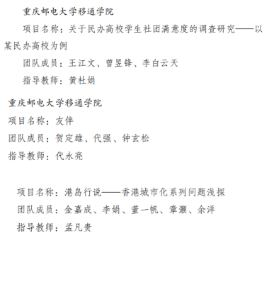 值得一提的是,获奖作品中,除历年报送的三大类作品外,由学生社团联合会主席团王江文、李白云天、曾昱锋三位同学报送的作品——《关于民办高校学生社团满意度的调查研究——以某民办高校为例》,属我校学生首次涉及完满教育方向的哲学社会科学类研究报告。