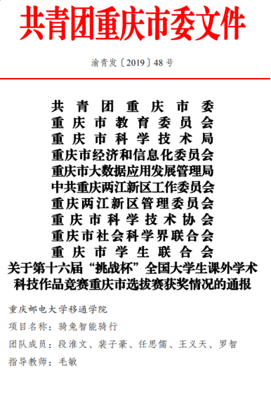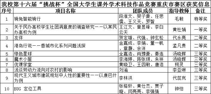 近日由团市委、市教委、市科技局、市经信委、市大数据发展局、两江新区党工委、两江新区管委会、市科协、市社科联、市学联共同组织开展的第十六届“挑战杯”全国大学生课外学术科技作品竞赛重庆市赛区的竞赛工作落下帷幕。我校共申报32件作品,通过校内层层选拔,报送15件作品参与市赛,分别获得特等奖一件、一等奖一件、二等奖两件、三等奖六件,再次刷新我校参加挑战杯赛事的新纪录。