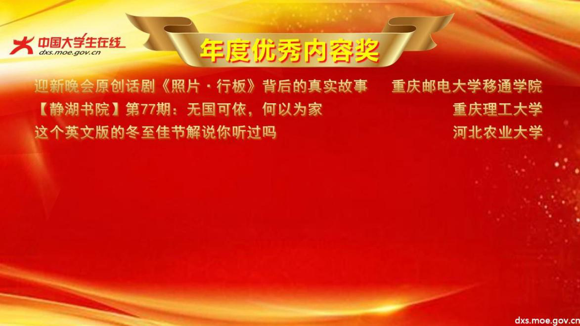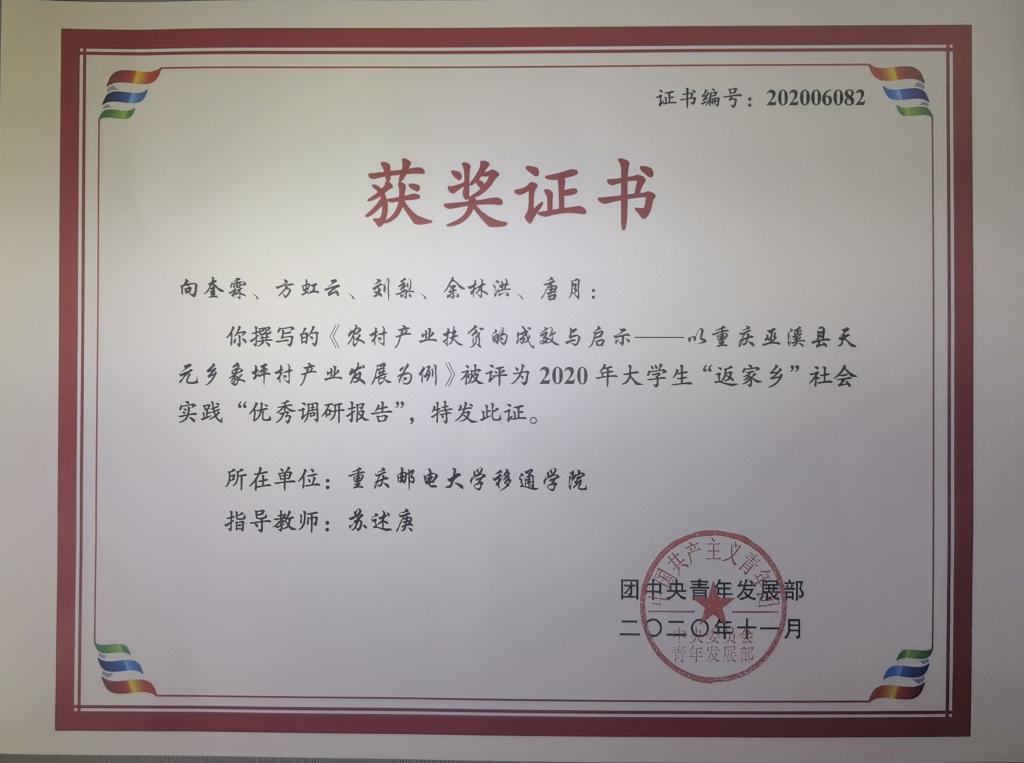 向奎霖、方虹云等同学撰写的调研报告《农村产业扶贫的成效与启示》被团中央青年发展部评为2020年大学生“返家乡”社会实践“优秀调研报告”;杨迪清荣获中国大学生在线校园网络通讯社2019-2020年度“优秀校园媒体人”称号,江铭宇撰写的《迎新晚会原创话剧<照片·行板>背后的真实故事》荣获“年度优秀内容奖”;周宝珠、汪子渲、牟欣瑶等8名同学在重庆晨报(上游新闻)创作季比赛中荣获优秀征文奖(不评等级),每人获得300-500元奖金。