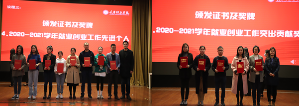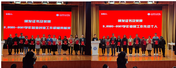 校长助理张平为郭淼等12人颁发第四届就业创业课程大赛获奖证书。校长助理张衍学为张旭等31人颁发就业创业工作积极贡献奖证书。校长助理刘枚为陈玲等15人颁发考研工作先进个人证书。副校长周伟为吴家家等9人颁发就业创业先进工作先进个人证书。校长助理刘枚为侯宇晶等5人颁发就业创业工作突出贡献奖证书。校长张德民为远景学院、中德应用技术学院、淬炼·国际商学院颁发就业创业工作先进集体奖牌,为中德应用技术学院、远景学院、大数据与软件学院、外国语学院颁发考研工作先进集体奖牌。