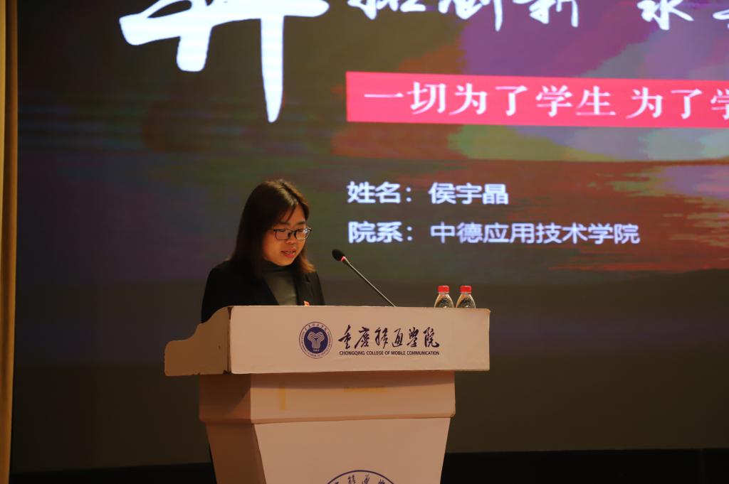 中德应用技术学院侯宇晶副院长作为就业创业工作突出贡献奖的代表以“高度重视、教学融合、典型引路、培养科学”为主题进行发言,她主要从围绕实现就业目标、提升就业质量、推进校企融合、拓宽校友渠道,抓好专升本的政策优势、积极与德国合作学校沟通保障出国项目顺利、与校企合作企业紧密沟通输送学生进行分享。