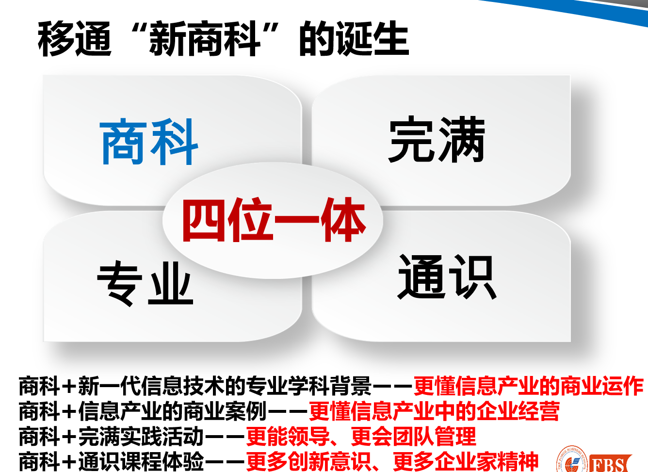 当前,信息产业飞速发展,大数据、云计算、人工智能助力于我们的生活和工作,商贸服务业进入消费升级、互联互通,新的经济业态开始呈现,新的商业模式也层出不穷。我校的新商科正是回应科技、社会、经济所带来的新挑战而创建的四位一体融合创新教育模式的商科体系:以信息产业行业为导向,结合学生的信息产业专业学科背景,打造专属领域的商业领导、管理能力等硬实力培养;同时充分与我校的完满教育和通识教育相结合培养学生的商业创新意识、企业家精神、沟通表达能力等商科软实力,最终致力于服务我校的神圣使命:培养未来经营管理的中坚力量。