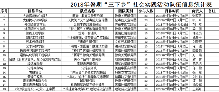 据悉为深入贯彻习近平新时代中国特色社会主义思想和党的十九大精神,按照《关于开展2018年全国大中专学生志愿者暑期文化科技卫生“三下乡”社会实践活动的通知》有关要求,我校积极开展了以“青春筑完满·奋斗新时代”为主题的2018年暑期“三下乡”社会实践活动,经过层层选拔与严格考察将派出18支队伍,以实际行动感受改革开放四十年取得的新成就新风貌,并在所到之处展现出来移通人的能力与魅力。