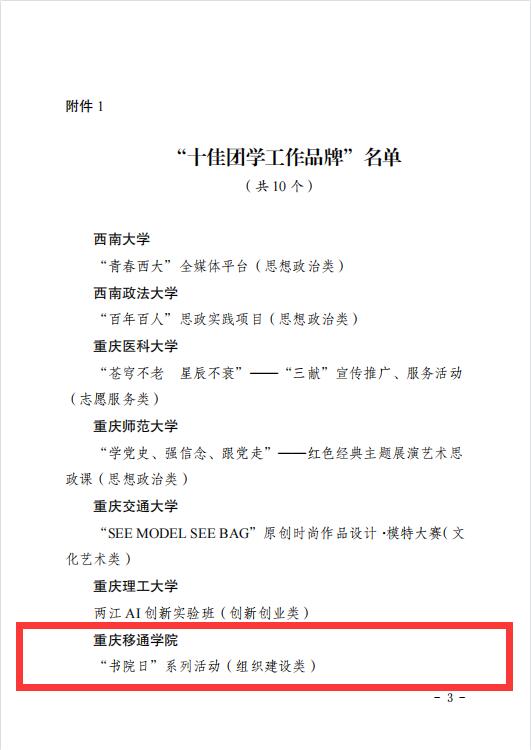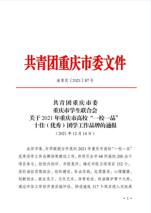 12月14日,共青团重庆市委、重庆市学生联合会下发《关于2021年重庆市高校“一校一品”十佳(优秀)团学工作品牌的通报》文件。由我校书院部、团委共同指导申报的“书院日”系列活动荣获2021年重庆市高校“十佳团学工作品牌”,再创我校书院类活动组织建设佳绩!
