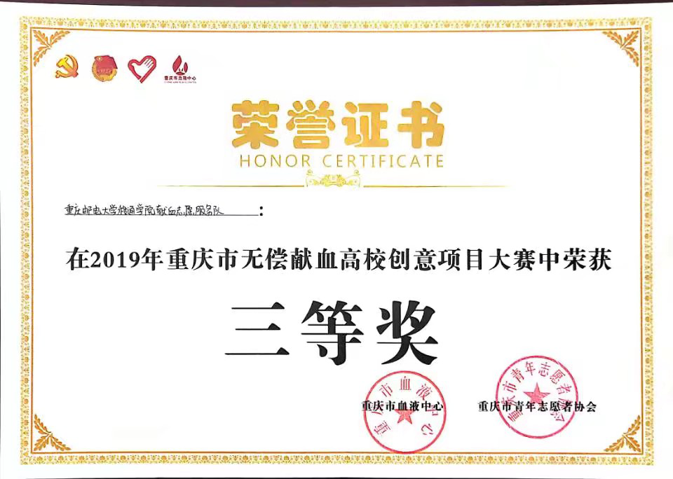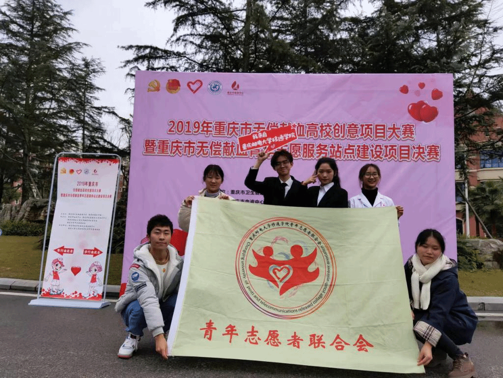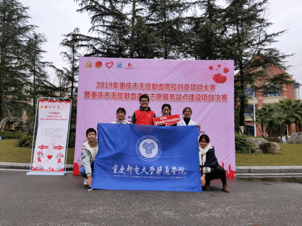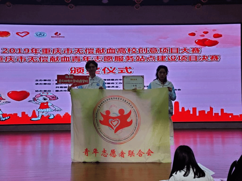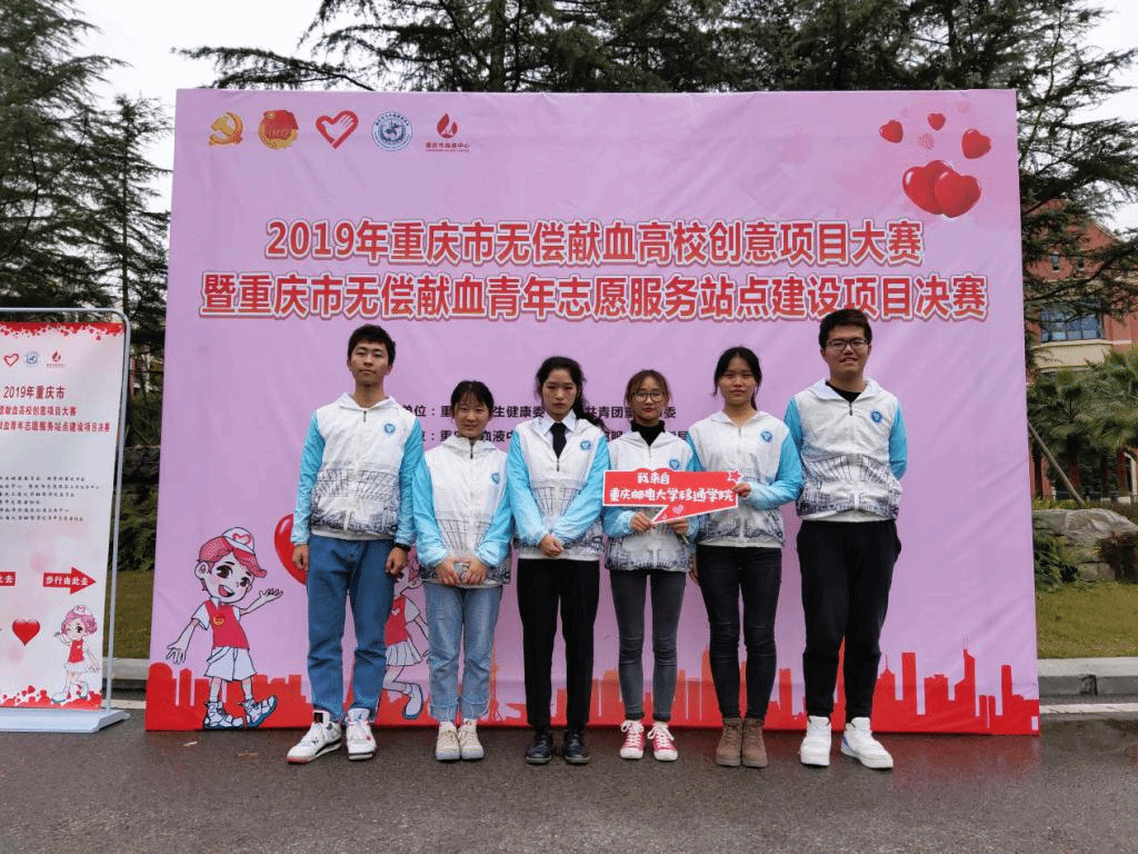 爱心成就梦想,志愿点燃希望。12月19日,由重庆团市委、重庆市卫健委为指导单位,市志愿服务工作指导中心、市血液中心、市青年志愿者协会及重庆市南岸区益友公益发展中心共同举办的2019年重庆市无偿献血高校创意项目大赛在重庆工商大学融智学院成功举办。本次大赛云集了重庆师范大学、重庆理工大学、长江师范学院等29所高校,共59个项目参赛。我校“血站进移通”无偿献血志愿服务项目,经筛选与专家评审进入决赛,通过现场路演答辩,荣获三等奖。