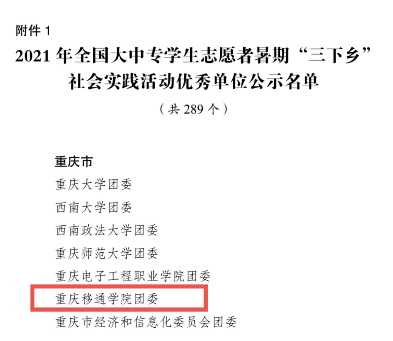 12月10日,由共青团中央青年发展部揭晓2021年度“三下乡”社会实践优秀单位公示名单,遴选出289个“三下乡”社会实践活动优秀单位,经基层申报、省级团委审核推荐、组织评议等环节,我校团委脱颖而出,荣获国家级优秀单位奖!