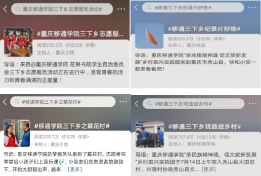 切实抓好志愿服务发声,突出活动重点与价值意义,将宣传工作做深、做实,我校团委以建党 100 周年为着眼点,23支队伍将团队成果制造出“三下乡”活动图册、手册、宣传单等 100 余份可视化成果。本次“三下乡”稿件多次在联合国日报、国际新闻网等100 余家主流媒体报道。网络报道 778 次在抖音、移通官方账号、学校校级组织官方账号等平台发布相关特色活动视频 62 个,受益人数达 11581 人次,阅读量达25425,浏览量高达 1910 万,增加系列成果影响力,让经历可追寻,价值可延续。