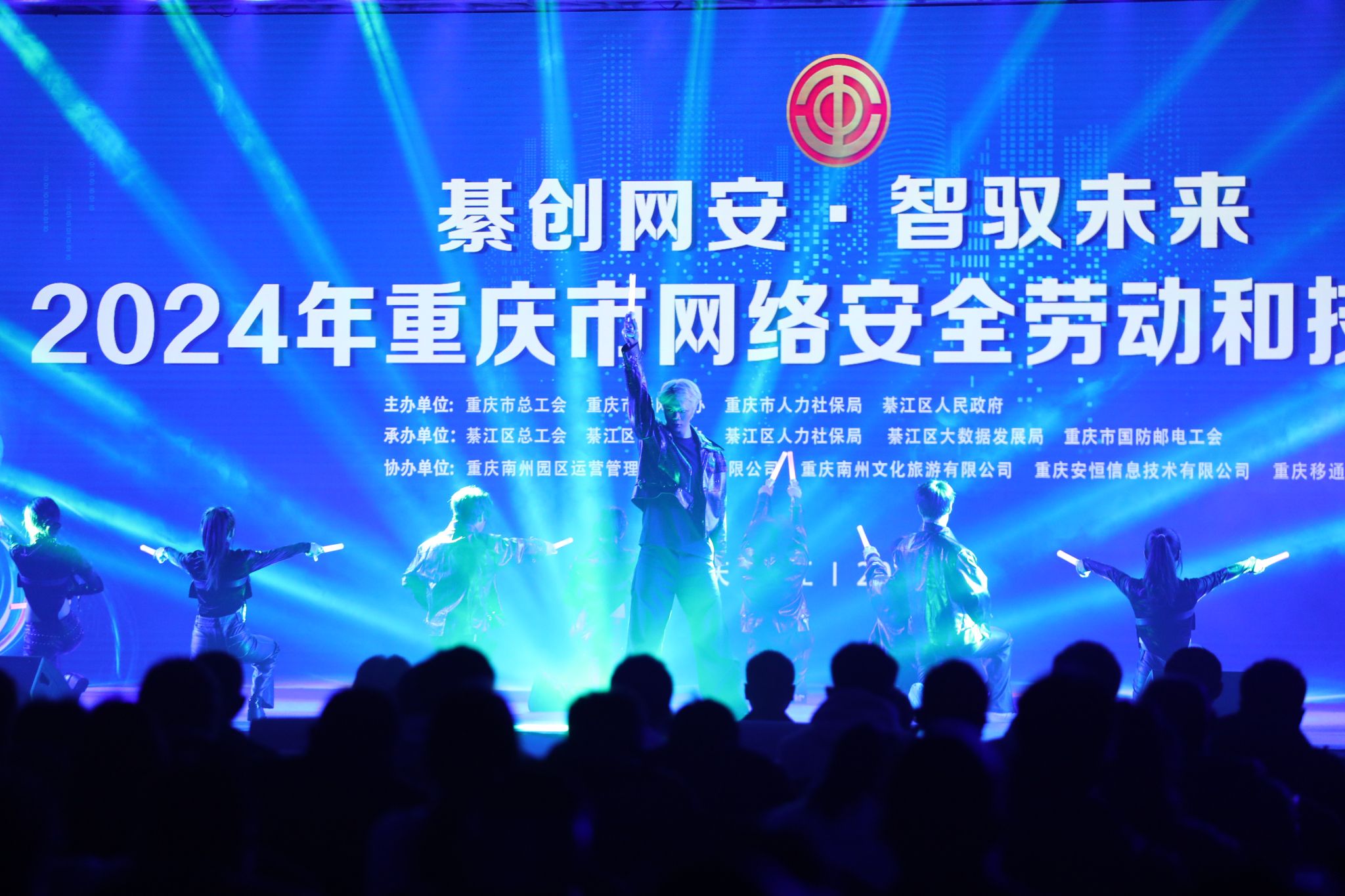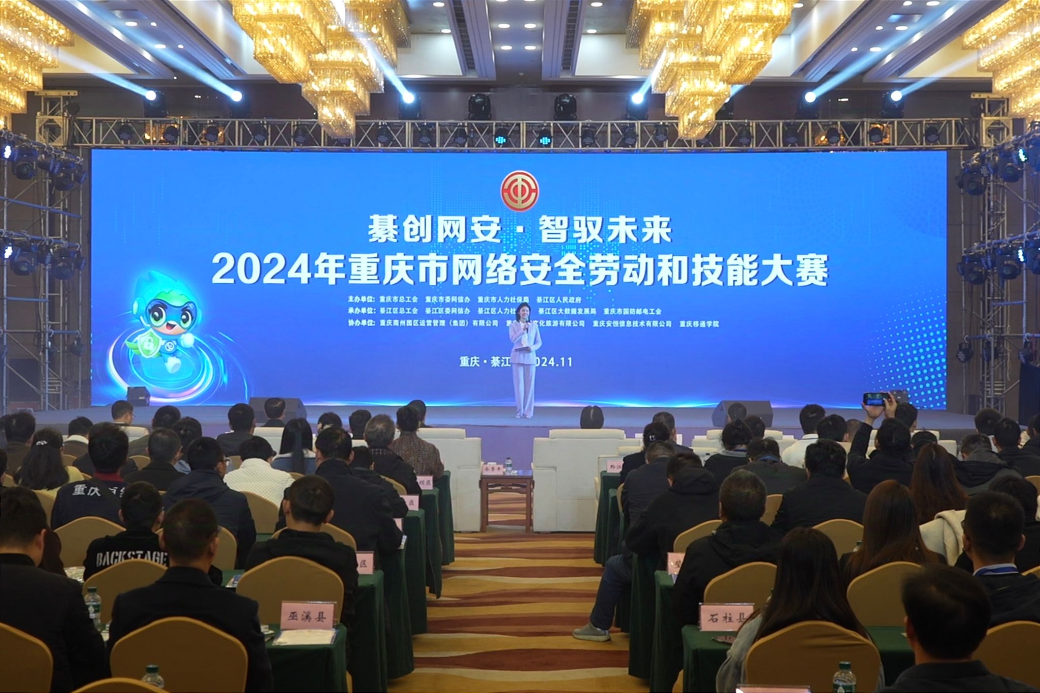 11月25日下午,“綦创网安 智驭未来”2024年重庆市网络安全劳动和技能大赛开幕式在綦江区普惠豪生大酒店举行。重庆市人大常委会副主任、市总工会主席陈元春出席并宣布开幕。綦江区委书记尹国喜致辞。市总工会党组书记、副主席余季平,市委网信办副主任魏春出席并讲话。区人大常委会主任唐鹏程,区领导任骏、蔡鹏、陈勇,重庆移通学院常务副校长王永周出席开幕式。