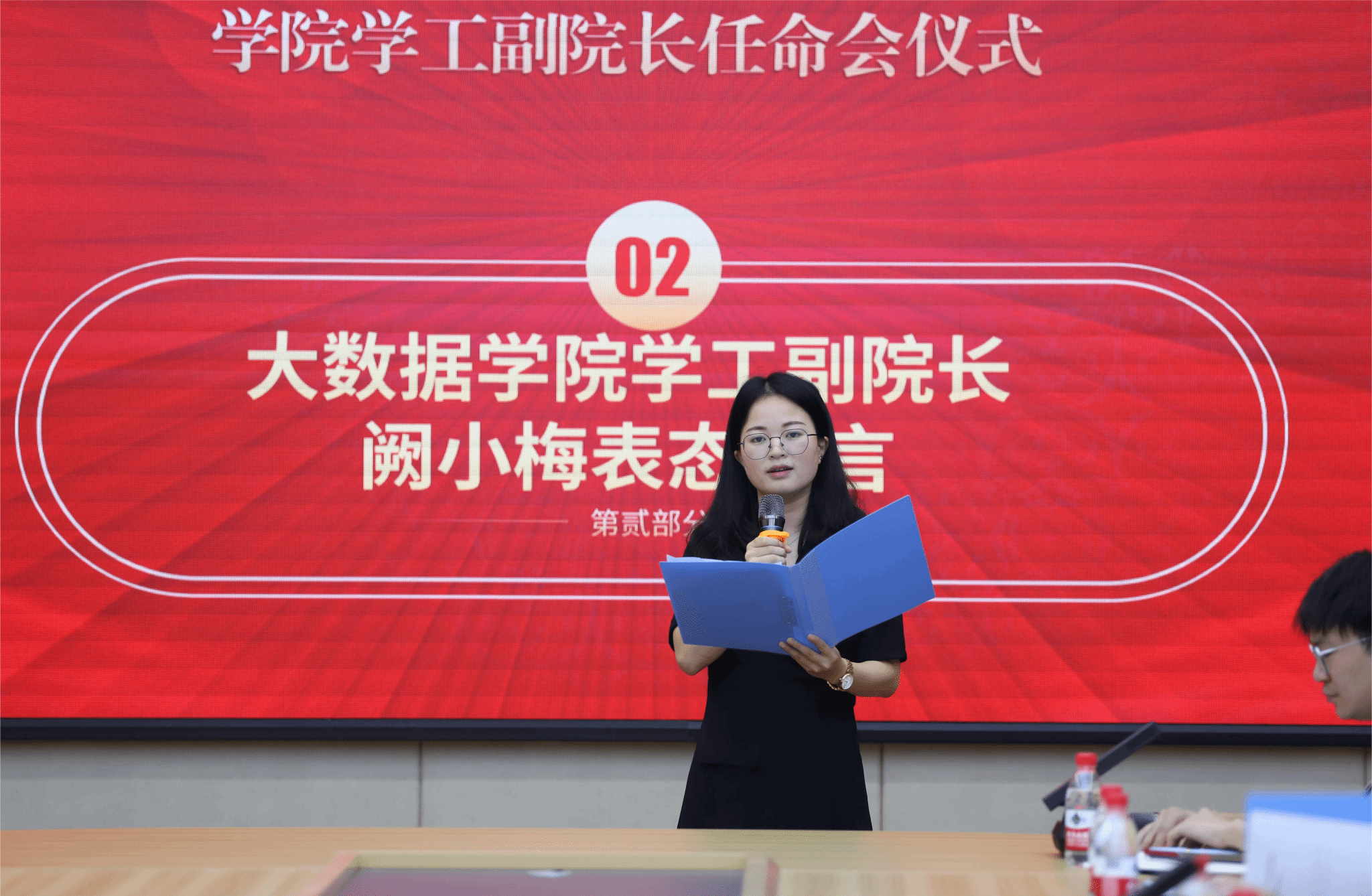 大数据学院学工副院长阙小梅用四个放心做表态:一是请学校放心,她会将工作使命扛在肩上,带出好队伍,交出好成绩,助力学校发展。二是请领导放心,她会继续保持积极进取的工作态度,为学校发展做贡献。三是请同事放心,她将不断提高自己的服务水平和管理能力,让团队成长为完满的学习型、专家化、专业化团队。四是请学生放心,她会继续坚守育人初衷,扎实为学生服务,努力为学生办实事。