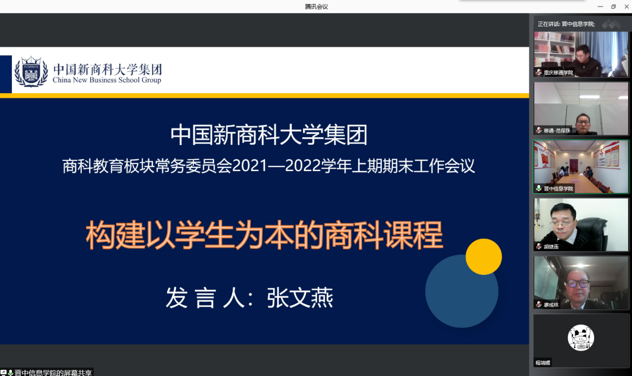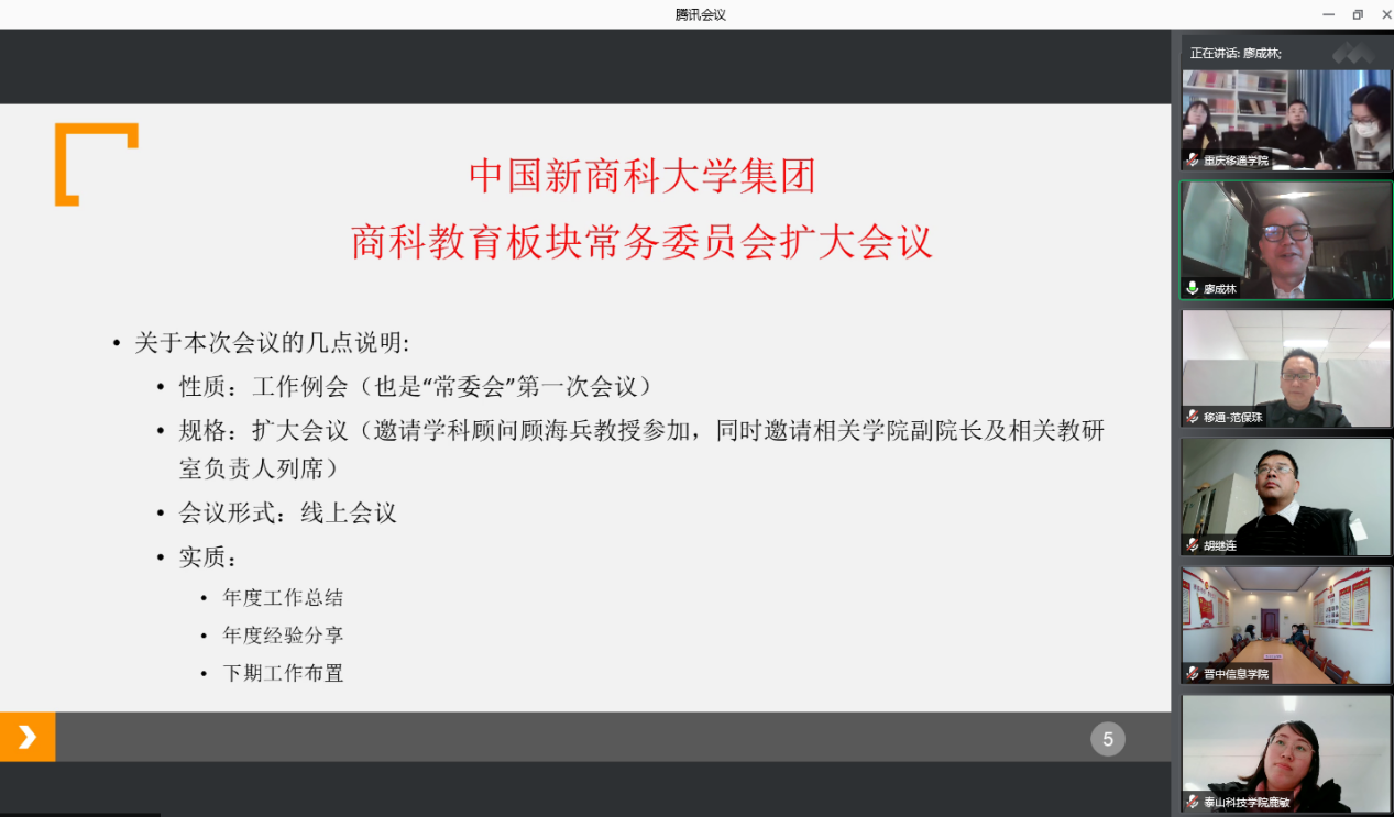 1月12日下午,中国新商科大学集团召开商科教育板块常务委员会2021—2022学年上期期末工作会议。中国人民大学经济学教授、博导、集团商科教育顾问顾海兵,重庆大学经济与管理学院教授、博导、集团商科教育委员会主任廖成林,山东农业大学经济学教授、博导、泰山科技学院常务副校长胡继连,晋中信息学院副校长苏琳,集团商科教育委员会主任助理、重庆移通学院校长助理兼淬炼·国际商学院院长张平,重庆移通学院淬炼·国际商学院副院长曾璐、范保珠、陈晓曼,晋中信息学院淬炼·国际商学院副院长许德芳,泰山科技学院淬炼·国际商学院副院长鹿敏等出席会议,会议主要就集团三校商科教育推进情况进行工作总结、经验分享及工作计划部署展开探讨。本次会议由廖成林教授主持。