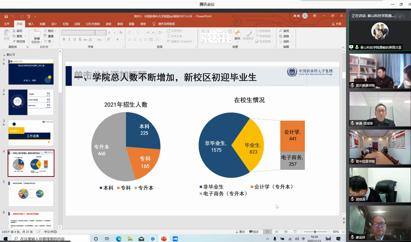 泰山科技学院淬炼·国际商学院院长鹿敏从工作进展、存在的主要问题、思考与计划三个方面进行汇报。她提到,学校商科教育取得了很多实效,在专业、课程、商科+等方面都有不少收获。但目前存在商科特色不够凸显、师生认同感不够、注重教师引领、实践与理论结合不够四个方面的不足。要加快专业建设强化体制,加快传统专业升级和新设专业的建设筹划,积极申报精品课程,逐步落实“专业建设服务学院”发展;坚持人才观念构架优质团队,优化师资队伍结构加大教师培养力度,持续推动教科研任务,保障课程的发展;建立人才培养方案动态调整机制,开展一流课程建设工作,加强实验室课程的管理,全面深化教学改革,持续推进考研就业,拓展服务功能。