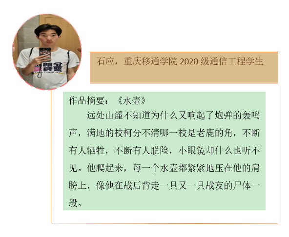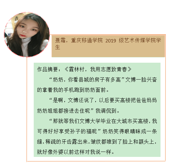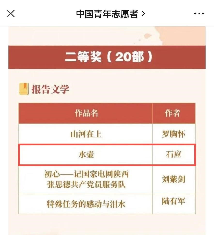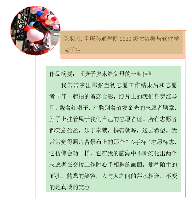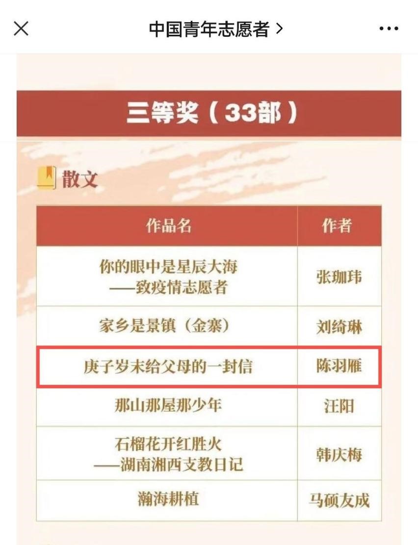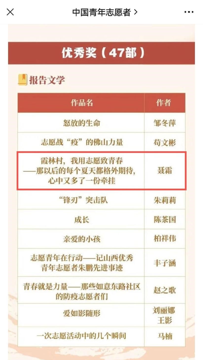二等奖作品《水壶》,讲述了作者以志愿者的视角走进贯穿退役老兵整个青春的军旅生涯中;三等奖《庚子岁末给父母的一封信》,讲述了在抗击疫情的大背景下,作者投身到防疫志愿工作中的一段亲身经历;优秀奖《霞林村,我用志愿致青春—那以后的每个夏天都格外期待,心中又多了一份牵挂》,描述了作者在霞林村支教过程中感触和点点滴滴。