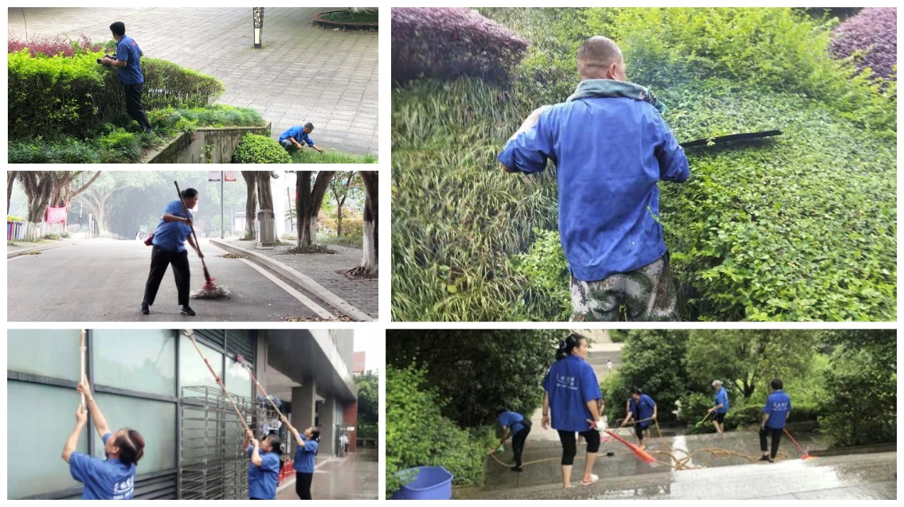 每天重复着同样的动作,清晨,大地还在熟睡,绿荫的厚重始终抵不住灼热的骄阳,热浪一阵一阵腾地而起,移通保洁员又开始忙碌的一天,冲洗地坝、道路清扫、防疫消毒、清理废旧杂物、植物养护等等。