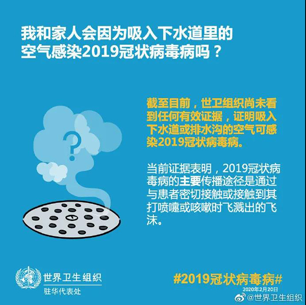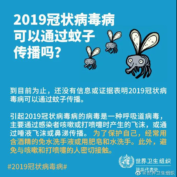 谣言1:新冠病毒可通过蚊子、下水道空气传播? 2月22日,世界卫生组织(WHO)在官方社交媒体回应2019冠状病毒是否会通过蚊子传播、是否会因为吸入下水道里的空气感染新冠病毒等问题,称目前为止,暂无证据表明新冠病毒可通过蚊子传播,也无证据证明吸入下水道或排水沟的空气可感染新冠病毒。