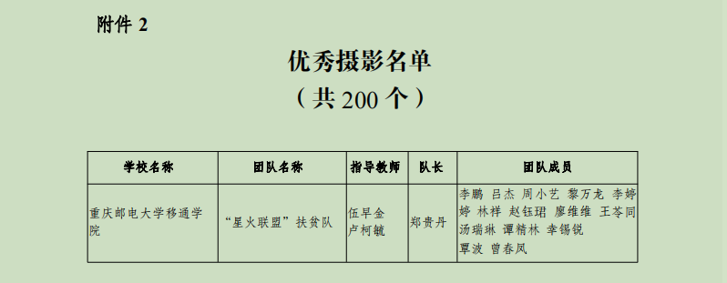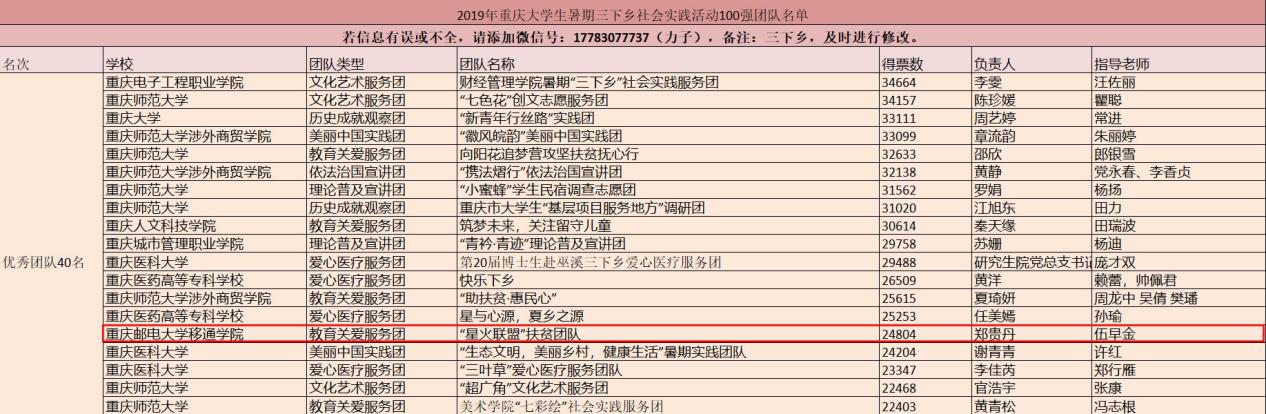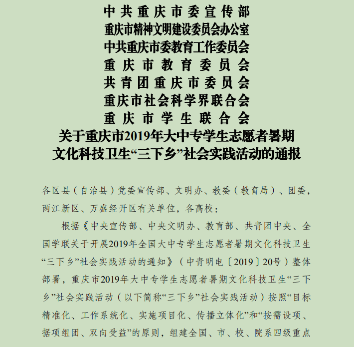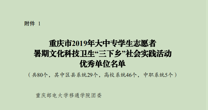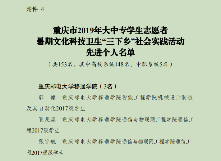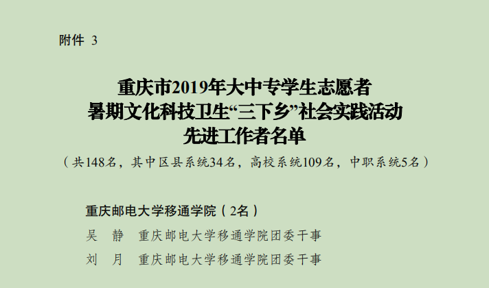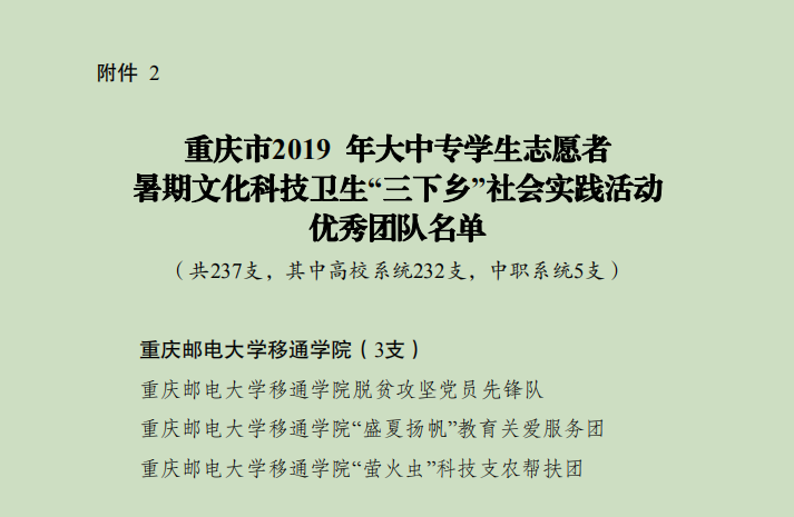 为深入学习贯彻习近平新时代中国特色社会主义思想和党的十九大精神,以青春建新功形式纪念五四运动100周年和献礼祖国华诞70周年,引导我校大学生勇担民族复兴大任、助力脱贫攻坚工作、切实投身乡村振兴战略行动。在2019年“三下乡”暑期社会实践活动中,我校表现突出,扎实推进各项工作,取得了可喜的成绩,荣获“2019年重庆市大中专学生志愿者暑期‘三下乡’社会实践活动优秀单位”荣誉称号。脱贫攻坚党员先锋队、“盛夏扬帆”教育关爱服务团、“萤火虫”科技支农帮扶团荣获优秀团队称号,校团委吴静老师、刘月老师荣获先进工作者称号,智能工程学院郭健同学、通信与物联网工程学院夏茂森同学、通信与物联网工程学院张宇航同学荣获先进个人称号。