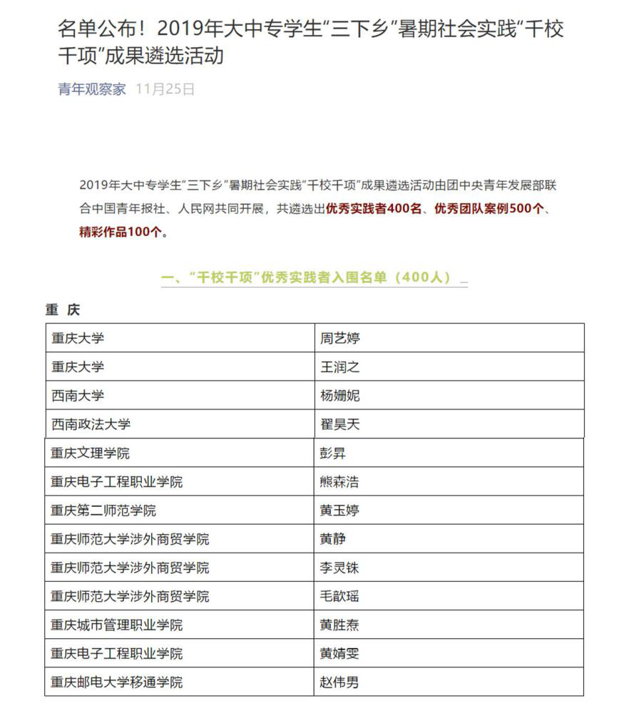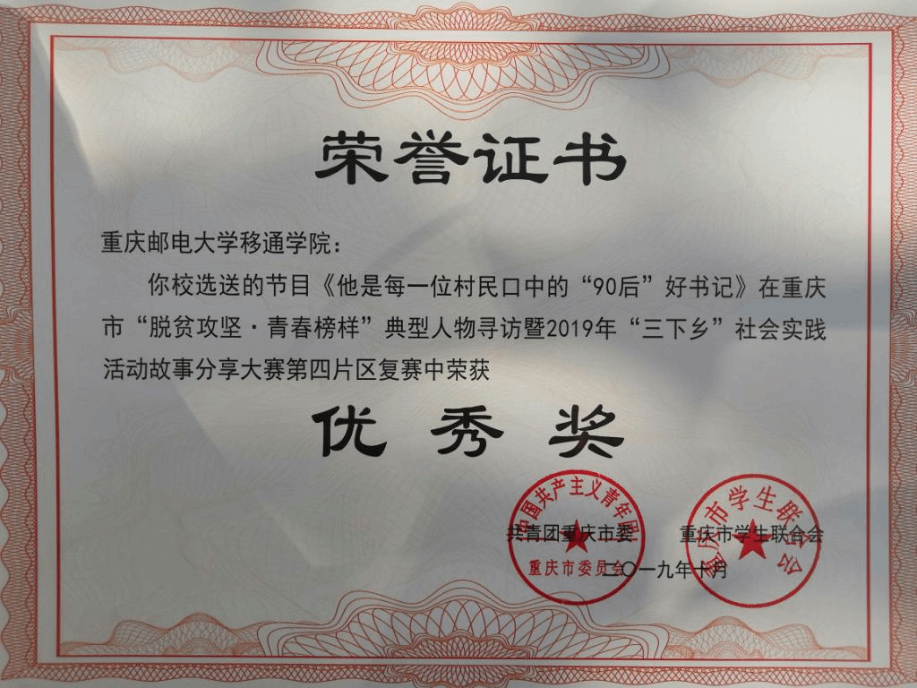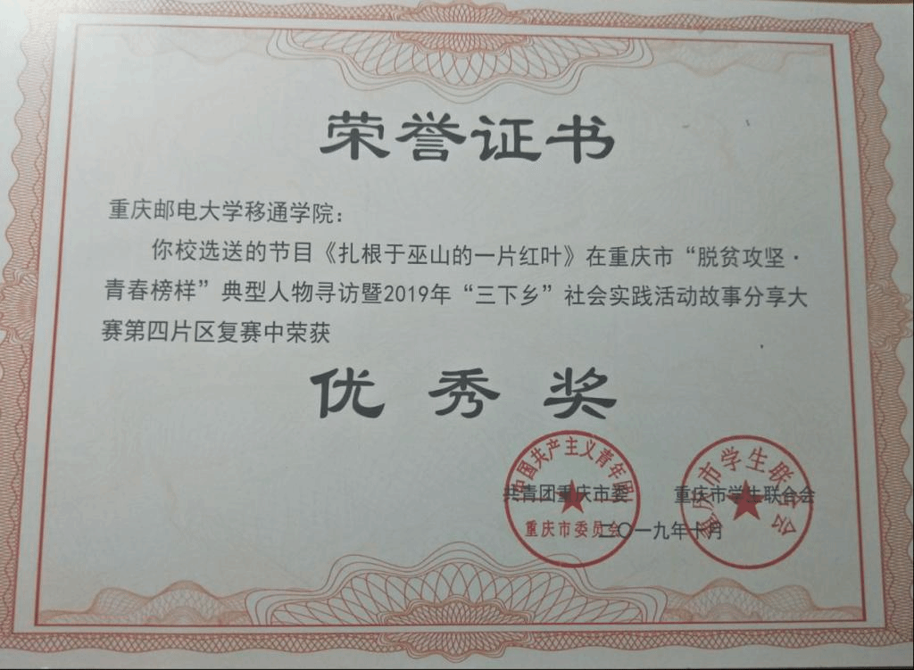 在重庆市“脱贫攻坚·青春榜样”典型人物寻访暨2019年“三下乡”社会实践活动故事分享大赛中,我校选送的《扎根于巫山的一片红叶》《他是每一位村民口中的“90”后好书记》荣获优秀奖。