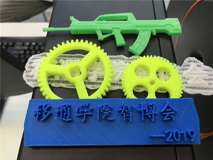 此外,四台3D打印技术分布在展台四周,可对现场观众进行人脸三维扫描,再打印出面部模型,或打印出齿轮、文字、玩机枪等各种形态,引得现场观众好奇地把玩,拍照留念。