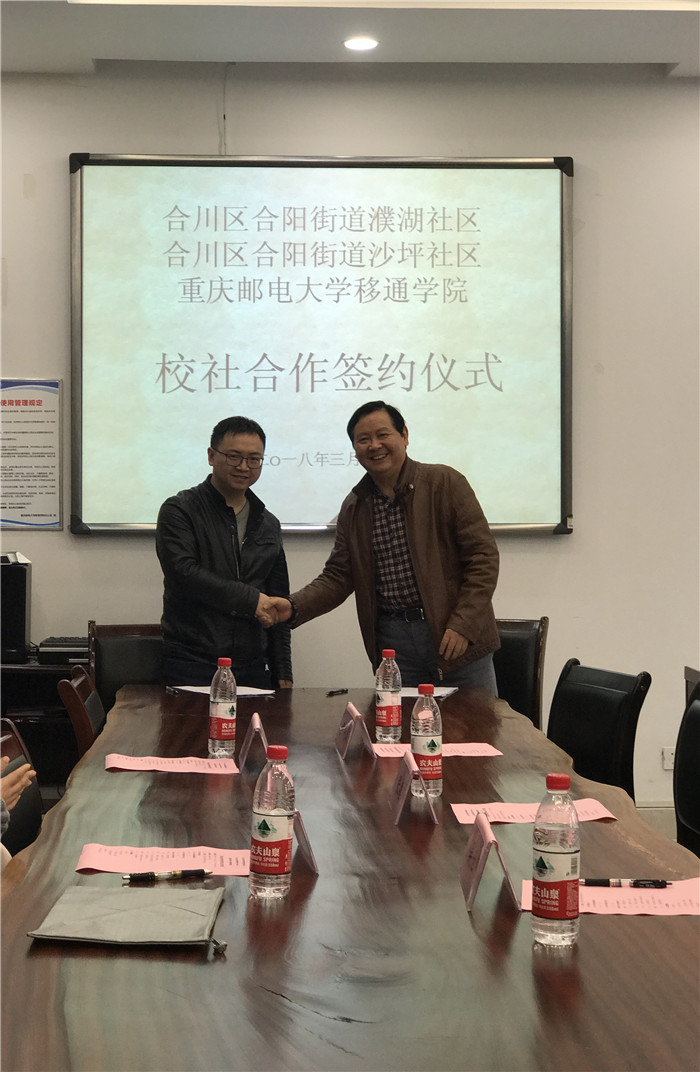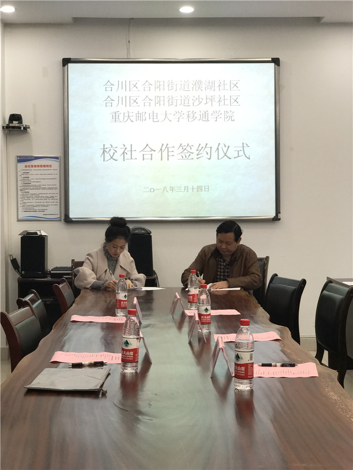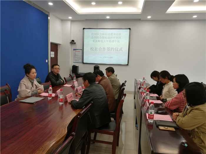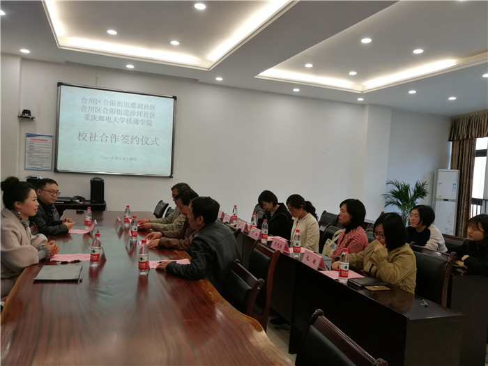 3月14日下午,重庆邮电大学移通学院与合川区合阳街道濮湖社区及沙坪社区在417会议室举行了首次校社合作签约仪式。院长张德民教授,副院长尹邦满博士,濮湖社区陈丽主任及沙坪社区王洪淋主任,外国语言文学系吴世银主任、英语专业教研室罗琳主任、德语教研室熊光源主任及系上部分教师代表出席签约仪式。签约仪式由吴世银主持。