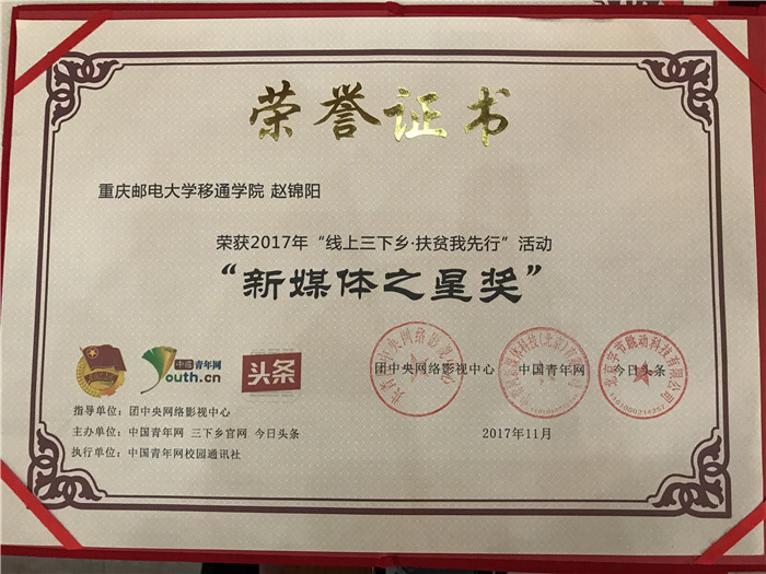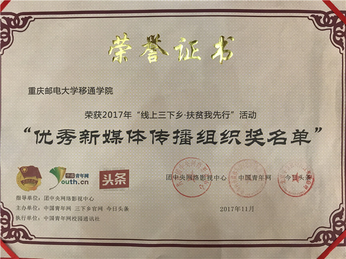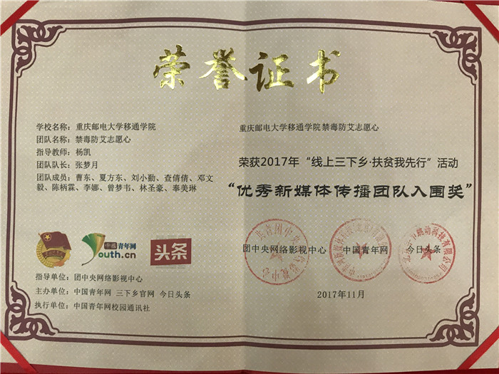 为表彰先进团队,传播社会正能量,12月26日,党的十九大精神进校园网络作品征集活动启动仪式暨2017年“镜头中的三下乡”、“线上三下乡·扶贫我先行”、“三下乡”直播评选总结会在对外经济贸易大学图书馆报告厅举行。我校与中国矿业大学、郑州大学等16所大学荣获“优秀新媒体传播组织奖”,我校管理工程系“禁毒防艾志愿心”三下乡团队荣获“优秀新媒体传播团队”入围奖,校“渝情观察团”三下乡团队成员、计算机科学系2015级计算机科学与技术专业赵锦阳同学荣获“新媒体之星奖”。