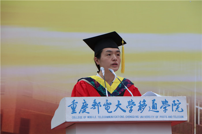 来自通信与信息工程系通信工程专业、现就职于腾讯科技有限公司的刘琦作为优秀毕业生代表,上台分享他的移通故事。他深情地回顾了自己在移通学院4年的成长历程以及大学学习生活的收获,向师长致以诚挚感谢,也说出了全体毕业生依依不舍的心声。