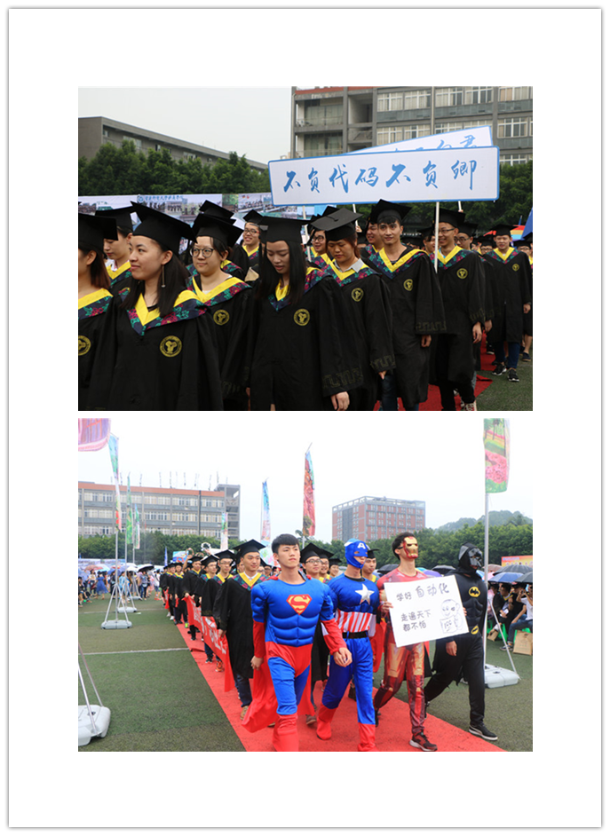 随着国旗、校旗的入场,2017届本科毕业生毕业典礼也拉开帷幕。伴着开场音乐的响起,学位委员会全体委员们首先向红毯阔步走来,他们将为在座的2500名毕业生进行授位。紧随其后的各个院系毕业生代表方队依次走上红毯,他们朝气蓬勃、英姿飒爽。自动化系毕业生高举“学好自动化,走遍天下都不怕”标语牌,将彩色纸飞机扔向空中,象征着他们对未来的自信;远景学院同学们脸上贴着印有远景学院LOGO的彩绘、手持远景标语牌,展示着远景学院毕业生的青春风采;而“不负代码不负卿”的计算机科学系则带着他们的吉祥萌物入场,增添了活泼有趣的气息,吸引了众多观众的注意......在雨水的洗礼下,毕业生队伍的每一步都铿锵有力,似乎在预示着未来他们定将风雨无阻,乘风破浪。