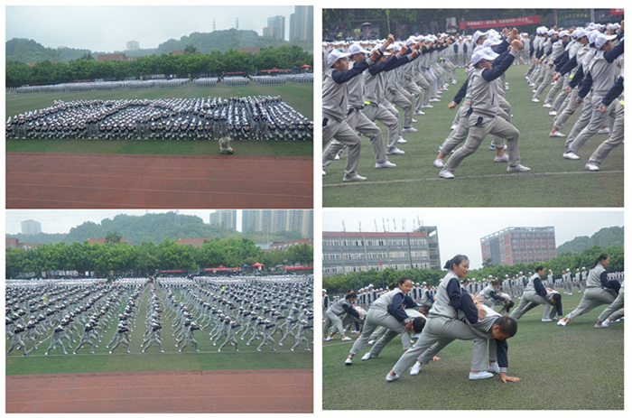 接下来的汇报表演科目气势宏大,精彩纷呈。军体拳方队冲拳别臂,击腰锁喉;勾拳顶肘,擒拿格斗。疾如风,徐如林。匕首操方队动作整齐划一,“凶狠”的刺杀,强健的身姿,无不展现出战士的勇敢和军人的刚毅。女子防身术和倒功组合方队的表演可谓是,千磨万击利刃铸,万练千锤武艺精。最后的手语操表演,更是汇集了近千人的表演,在操场上摆出了“YTXY”的图样,并在《国家》的音乐下进行手语操表演,十分震撼。手语操方队用标准的手语动作、完美的配合给14天的训练画上一个完美的句点。