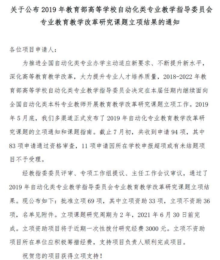 此次立项是智能工程学院荣获电气类专业教学指导委员会教改项目立项之后第二次主持教育部高校专业教指委教改项目,体现出我校智能工程学院在专业建设与学科发展思路上积极探索,深入贯彻教育部本科教育新思想,深化高等教育教学改革,探索校企合作协同育人模式,深入推进自动化类专业办学水平提升,努力提升专业人才培养质量。此次项目成功获批,是展示智能工程学院在教育教学改革、专业建设的等方面的工作成果,也是在新型二级学院建设、“控制科学与工程”重点学科培育等工作基础上迈进一步。