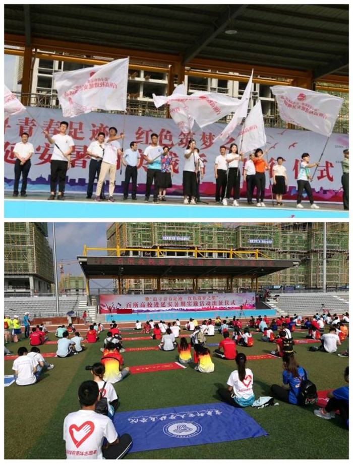 早在6月中旬,我校就组建了暑期“三下乡”社会实践活动新时代党员先锋队申报由共青团中央学校部、陕西团省委、中共延安市委、延安市人民政府主办的“追寻青春足迹·红色筑梦之旅”2018年全国大学生延安实践专项行动,最终从全国五百多所高校近千支团队中脱颖而出,与清华大学、北京大学等一道成为了暑期“三下乡”全国专项团队,开始了百所高校百支团队助力延安之行。在活动出征仪式上,我校志愿者作为全国百所高校学生代表从共青团中央学校部副部长石新明同志手中接过了实践旗帜。