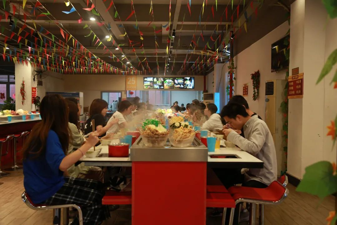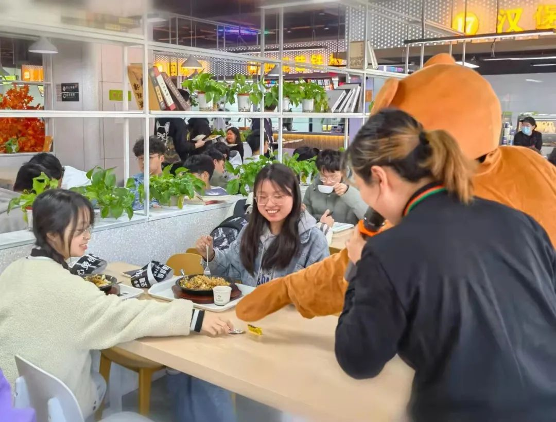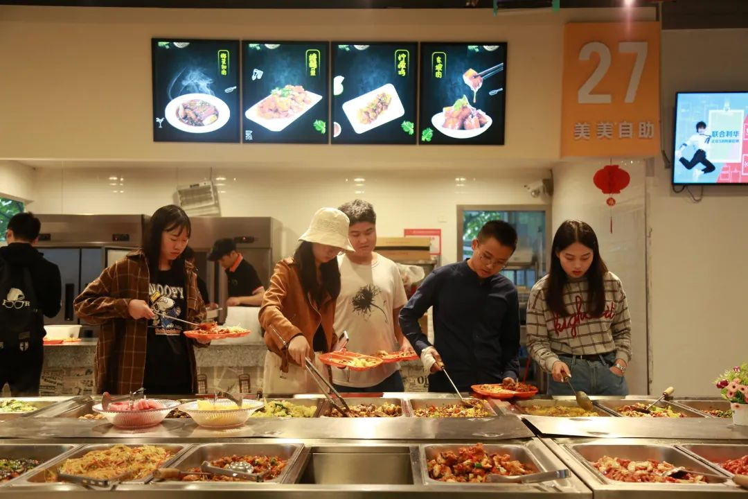 走过长长的天梯,我们来到合川校区三江食堂,大沙发柔软舒适,弧形小包间造型独特。这里的自选菜、自选水饺、冒菜、铁板菜、减脂轻食等均可按需自主拿取,想吃多少拿多少,想吃什么拿什么,可谓是“最自由”的食堂。