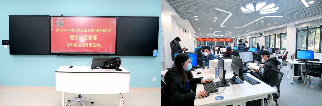 重庆市高校思想政治理论课教师教学技能竞赛是由重庆市教委主办的重庆地区思想政治教育教学能力评比最高级别赛事,今年也恰好是连续开展的第10个年头。总决赛共设教学设计和现场授课两个环节。在教学设计环节,按照比赛讲深讲活讲透的要求,参赛教师要在两个小时内围绕党的二十大报告中中国共产党的中心任务,有机融入所讲授思政课的有关章节,完成教学设计和教学课件的制作。在现场讲授环节,参赛教师按照随机抽取的章节题目,进行15分钟的现场授课。两位老师以贴近学生关心的时事为案例,循循善诱,将知识讲授与价值引领有机融合,晓之以理,动之以情。展现了我校思想政治理论课教师扎实的专业素养。