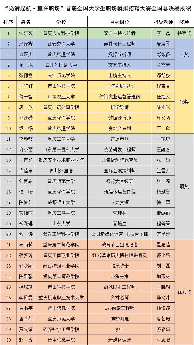 首届全国大学生职场模拟招聘大赛已圆满落下帷幕,本次大赛共计辐射24万余名大学生、吸引全国19个省事、102所高校,通过组织全国高校学生比拼求职能力,在“理论+实践”、“校内+校外”、“线上+线下”指导模式的基础上,坚持以赛送指导、以赛提技能、以赛促就业,加强成果转换,促进高校毕业生高质量充分就业。