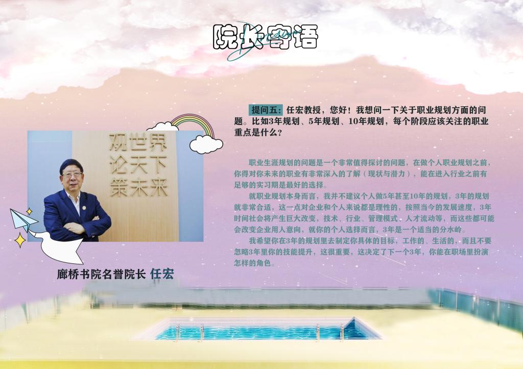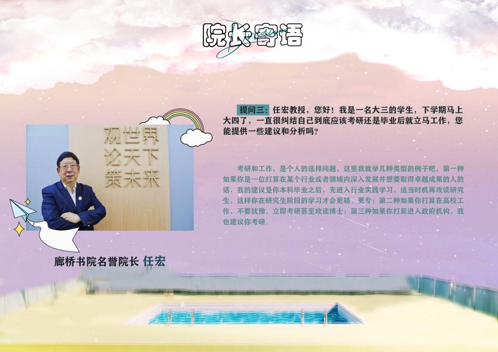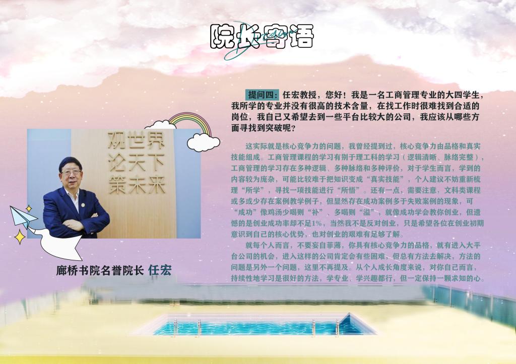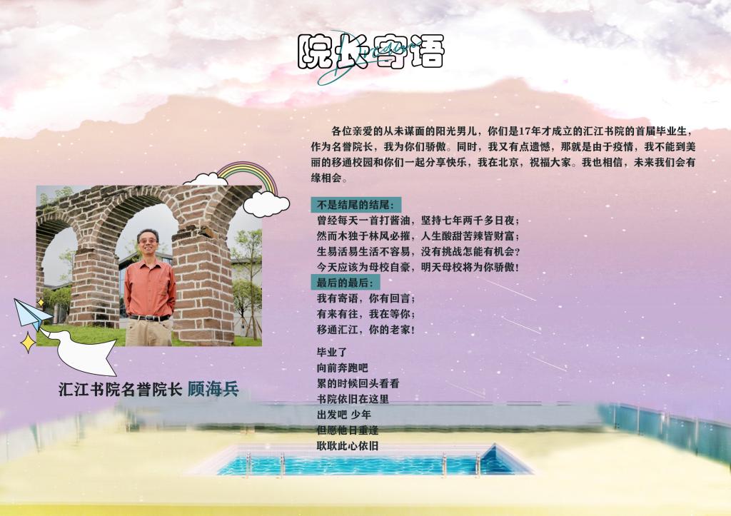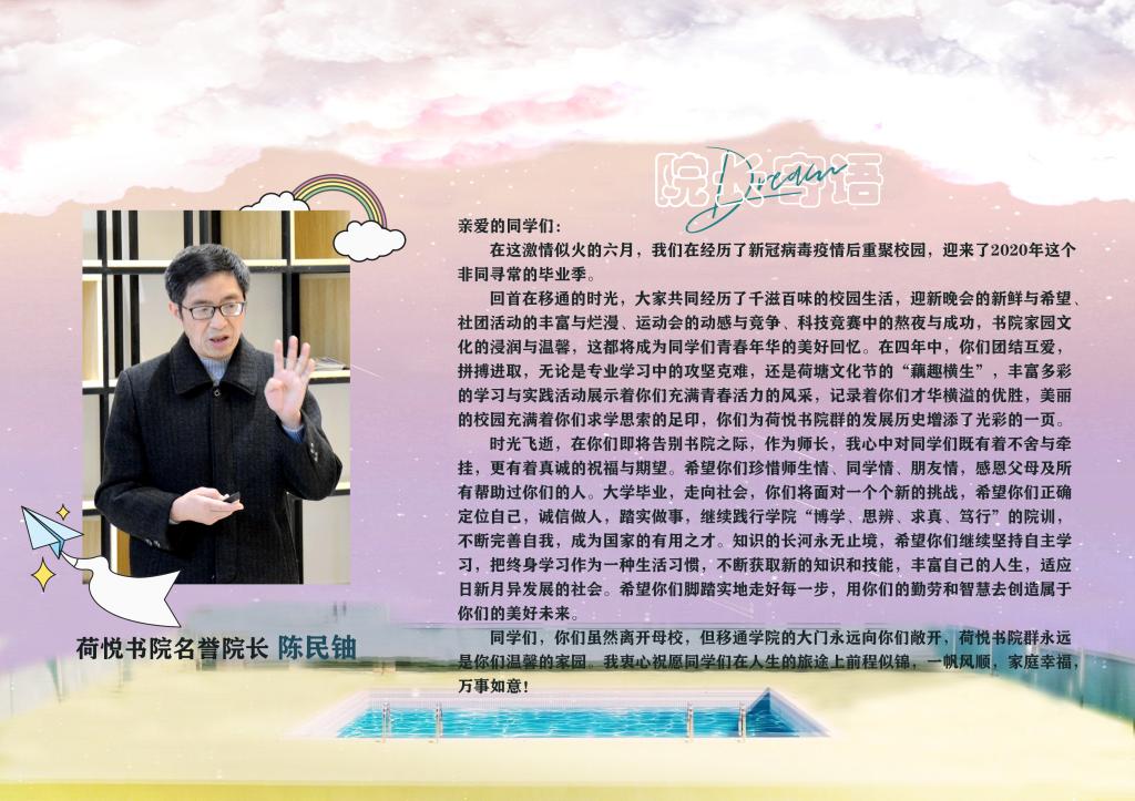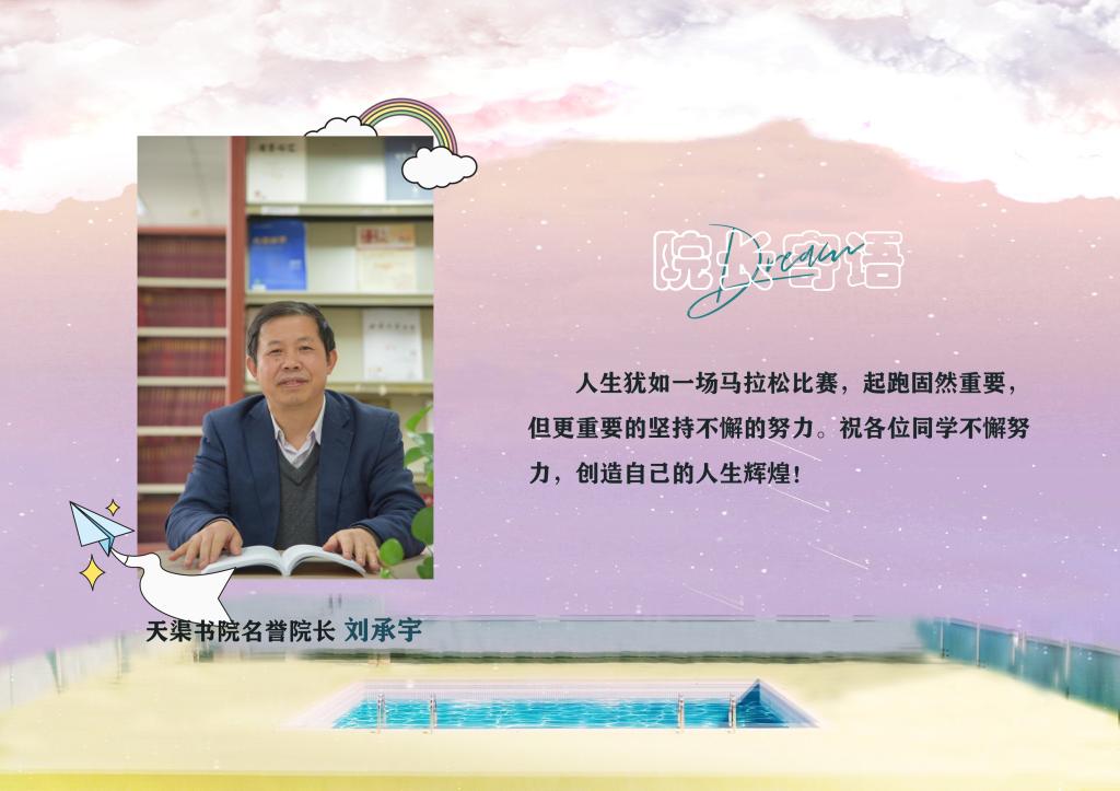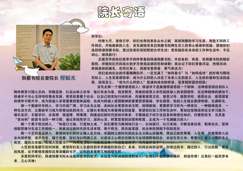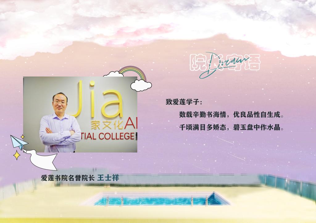 书院是传统教育阵地赋予现代教育内涵的创新育人机制,是我校全员、全方位、全过程、全天候育人的思想政治教育新举措。作为社区化、交互性、共享式的育人平台支撑学校“信息产业商学院”办学愿景,依托家文化和领导力双核驱动实践育人、文化育人、服务育人质量提升,为学生创造社区共享与朋辈互助的新圈层。各书院名誉院长作为书院内涵建设的“精神领袖”,在书院的发展与建设方面具有举足轻重的作用。当下,正值毕业季,为了更好的为毕业生保驾护航,各书院名誉院长纷纷通过问答、书信、诗词、视频等多种方式为毕业生寄语,助其在接下来的人生道路上无畏荆棘,昂首前行!