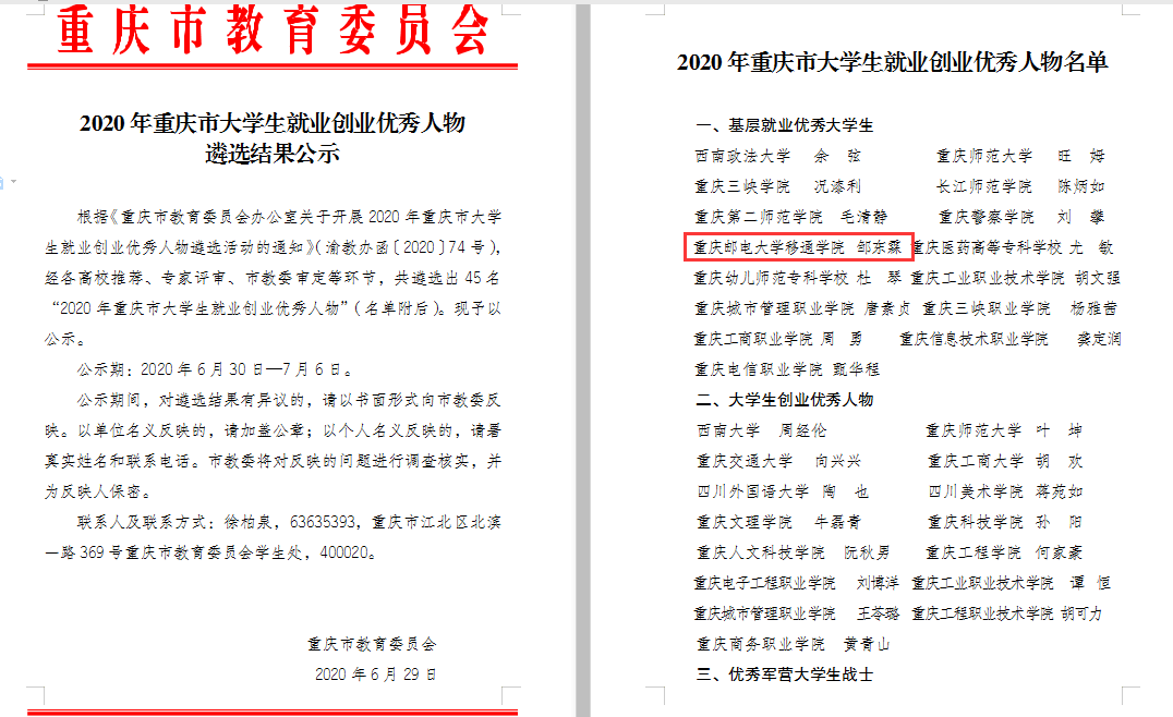 日前,市教委印发《重庆市教育委员会办公室关于开展2020年重庆市大学生就业创业优秀人物遴选活动的通知》(渝教办函[2020]74号),我校淬炼商学院2014级毕业生邹东霖获评“基层就业优秀大学生”称号。