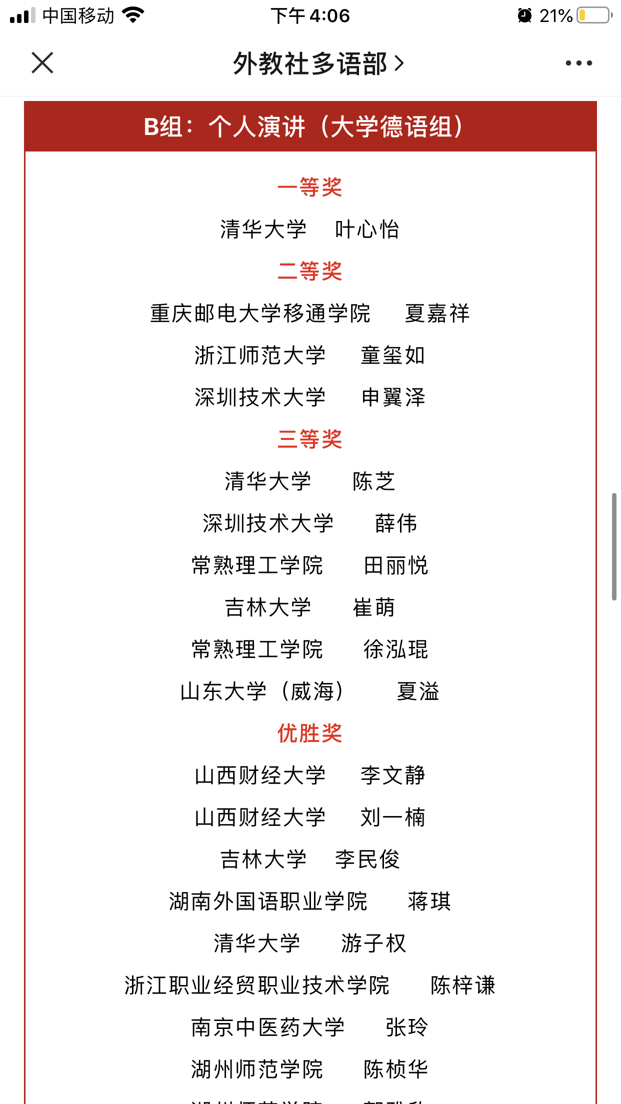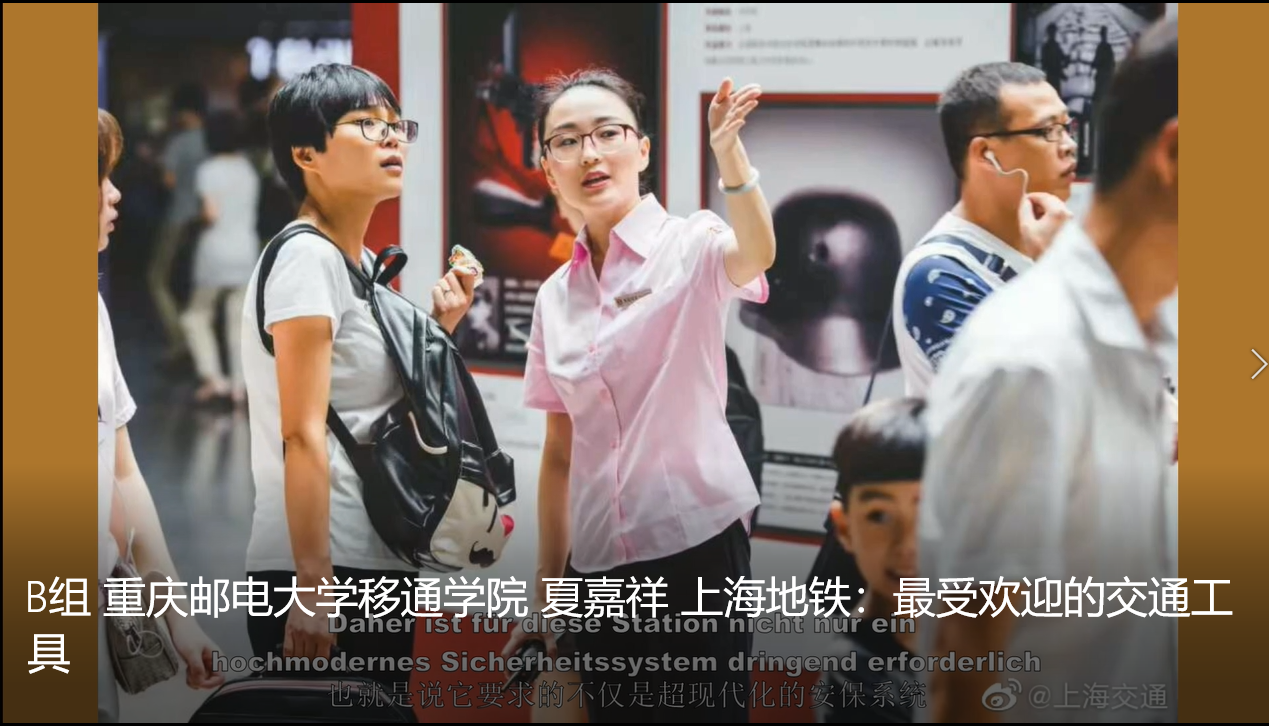 近日,我院中德学子在上海外教社举办的第三届“全国大学生德语微视频大赛”全国总决赛中喜获佳绩。来自中德学院2017级的夏嘉祥同学凭借作品《Die U-Bahn von Shanghai: Das beliebteste Verkehrsmittel——上海地铁:最受欢迎的交通工具》荣获大学德语组二等奖,2017级刘译心同学的作品《Wandern in der Heimat——漫游故里白鹤缘》获得优胜奖,指导教师曹雪姣获得“优秀指导教师”称号。