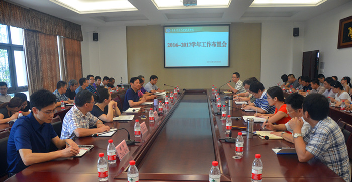 8月23日上午,我校2016-2017学年工作布置会在行政楼107会议室召开。校领导张德民、李茂军、尹邦满、王征、周德才、刘绍友、尹浩亮、周伟等出席大会。全校科级及以上干部、各院系负责人等近50人参加大会。