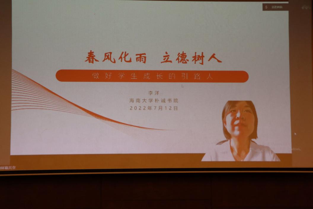 作为海南省唯一一名“全国高校辅导员职业能力大赛一等奖”获得者,海南大学李洋老师给大家带来《春风化雨,立德树人,做好学生成长的引路人》的专题报告,李老师用自身十三载“辅导员”的经历来做案例、工作思路分享,并表示到我们每一名教育工作者都是自身领域的“辅导员”,都有“教育”“管理”的双重职责,大道至简,音韵相通,希望大家内化于心,以学生为中心,把全员全程全方位育人落实到岗位上,因时而化,因时而进,因势而新,审视传统方法,创造新的途径。