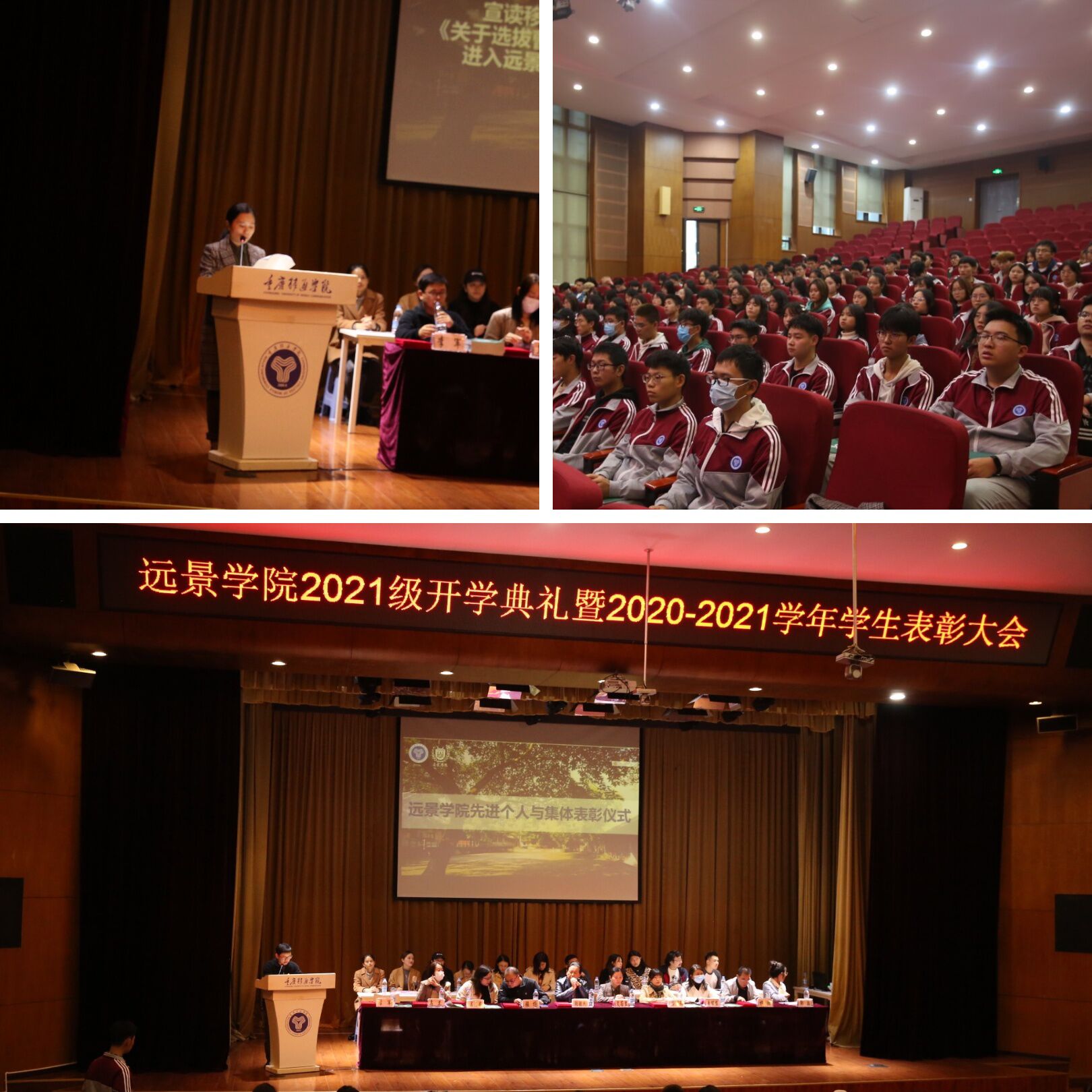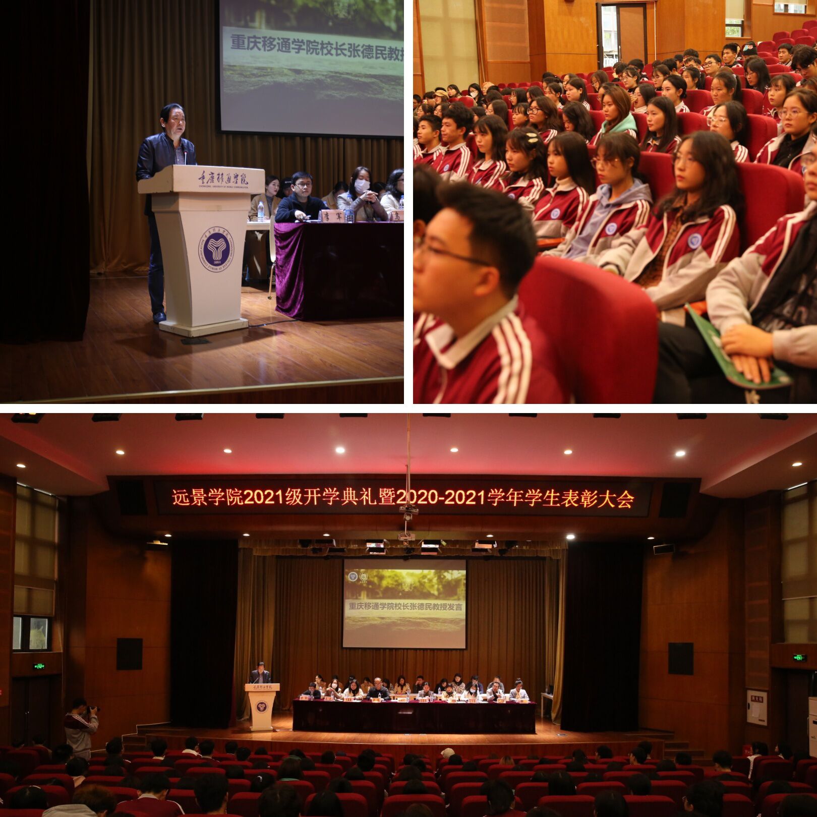 9月重庆移通学院远景学院通过集中宣讲、笔试测验、面试选拔以及性格测试等环节,从全校新生中选拔出认同远景教育理念的118位优秀学子加入远景大家庭。为欢迎新一届远景新生的加入,促进新一学年远景学院各项工作的开展, 10月20日下午四点,远景学院2021级新生开学典礼暨2020-2021学年学生表彰大会在下里巴人剧场隆重举行。重庆移通学院校长张德民教授、远景学院执行院长皮若兰,学工副院长李军、教学副院长强杨、以及远景学院全体教职工、高年级学生代表、2021级全体新生和家长代表参加了开学典礼,会议由学工副院长李军主持。