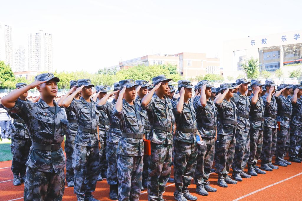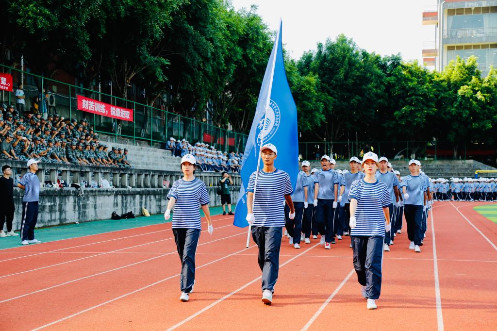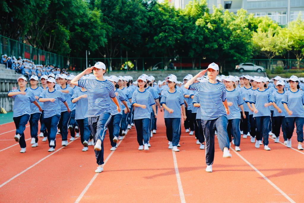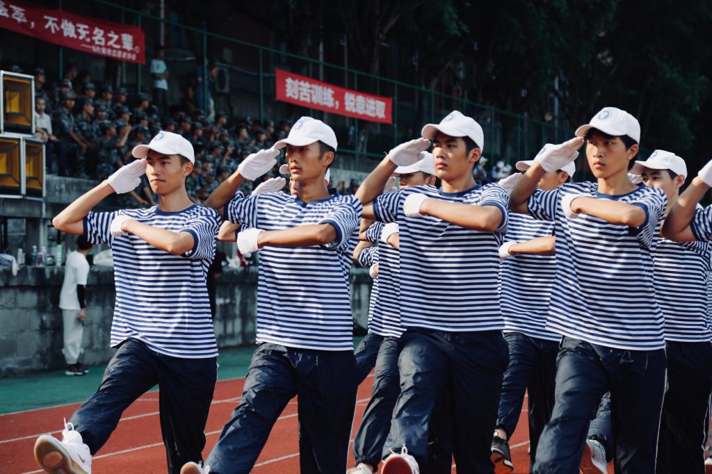 伴随着激情高亢的音乐,各连队在教官的口令声中进行了分列式军训汇报表演,各个连队依次走向主席台,向主席台的领导展示这半月来的蜕变。他们抬头挺胸、步伐沉稳,队列整齐,气势如虹,踩着音乐的节点,口号震天,在教官的有序指挥下,迈着矫健、整齐划一的步伐,敬着庄严、孔武有力的军礼通过主席台接受检阅,展示出英姿飒爽的“准军人”形象。