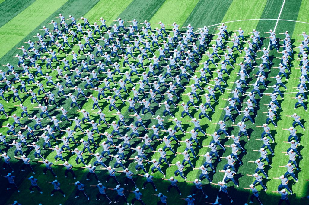随后,进行了精彩的匍匐刀、军体拳、手语操等表演。在哨令下,匍匐刀表演威武敏捷、杀声震天;军体拳整齐划一、精神抖擞;手语操气势恢宏、意气风发。今年是新中国成立70周年华诞,《我和我的祖国》的歌声响彻神州大地,爱国是每一个中国人的责任与担当,参加军训,接受国防教育正是大学生爱国的一种表现。军训方阵别出心裁的展现出“中国1949-2019”字眼,齐声喊出“祝新中国成立70周年生日快乐!”,嘹亮的口号直冲云霄,用这一特殊的方式向祖国献礼。