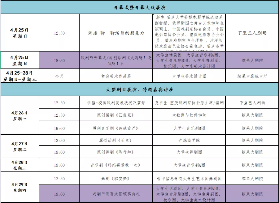 本届戏剧节于4月24日开始,以“感”为主题,持续6天超长汇演,9大学院倾情献演,带来一场戏剧嘉年华,2场大师讲座,21场大小剧目,共计367人的创作团队,涵盖涵盖歌剧、舞剧、话剧、情景剧、短剧、舞台剧等众多戏剧种类,尽情体验戏剧魅力。