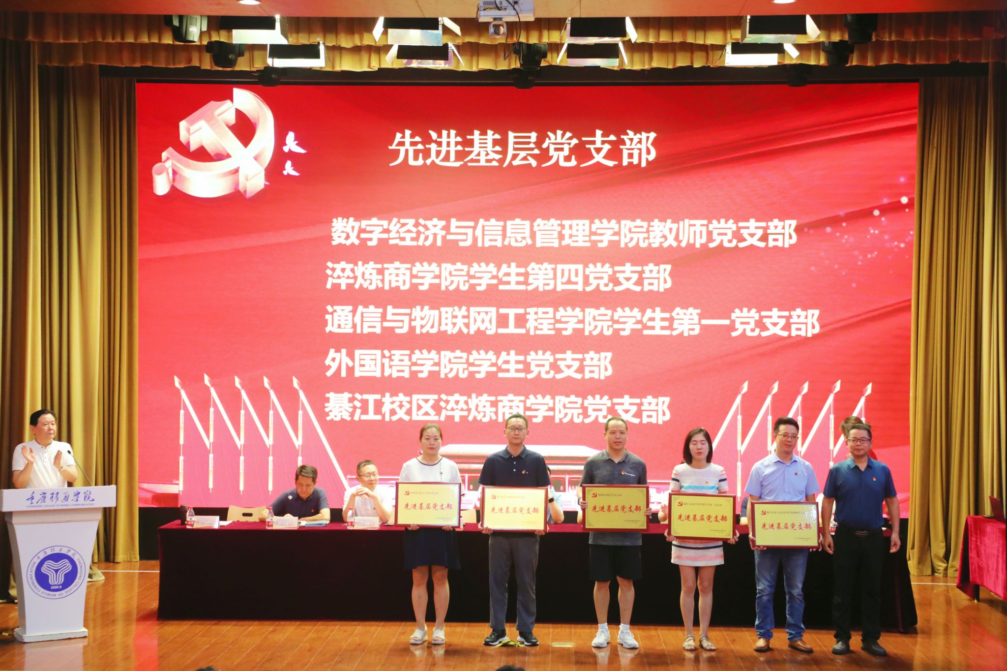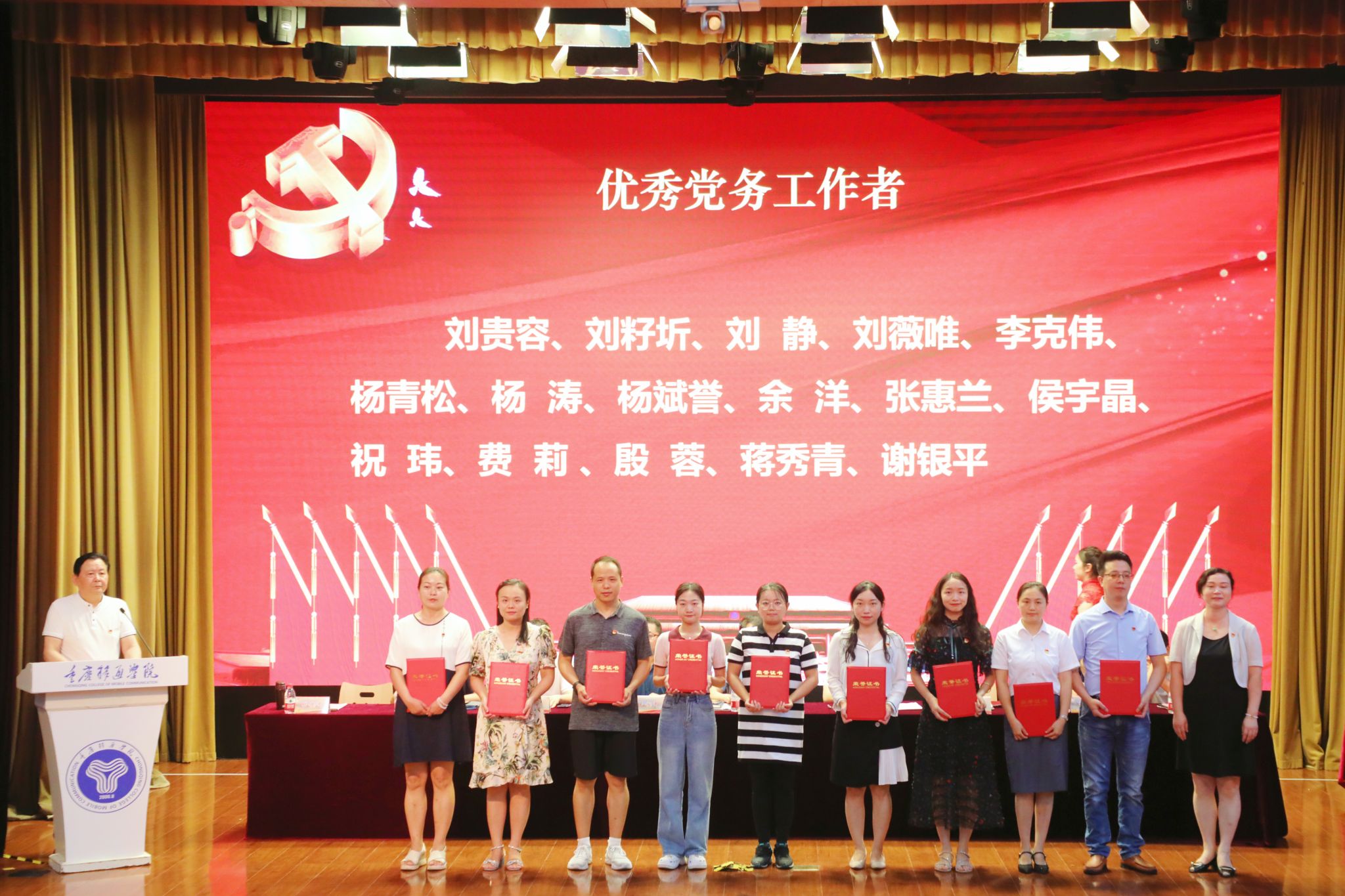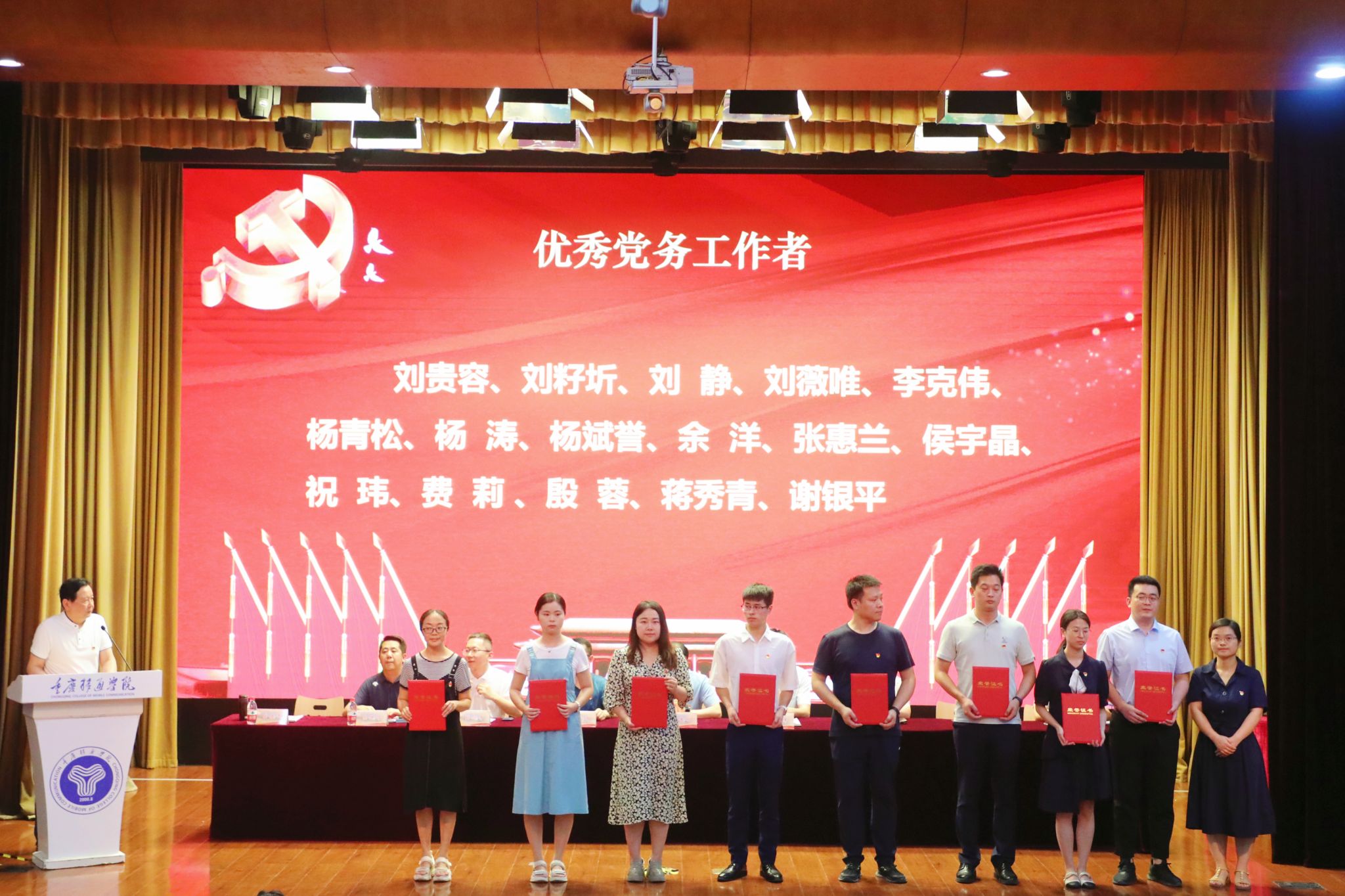 大会在庄严的国歌声中拉开序幕。党委委员、副校长张衍学同志带领新党员宣誓、老党员重温入党誓词。党委副书记、副校长周伟同志宣读《中共重庆移通学院委员会关于表彰2023年先进基层党组织、优秀党务工作者和优秀共产党员的决定》。在振奋人心的音乐中,党委书记何先刚,党委委员、綦江校区党委书记、常务副校长、綦江管委会主任王永周,党委委员、副校长孙玺,党委委员、校长助理刘枚,校长助理陈仲华为先进基层党组织、先进基层党支部、优秀党务工作者和优秀共产党员颁发荣誉证和奖牌。