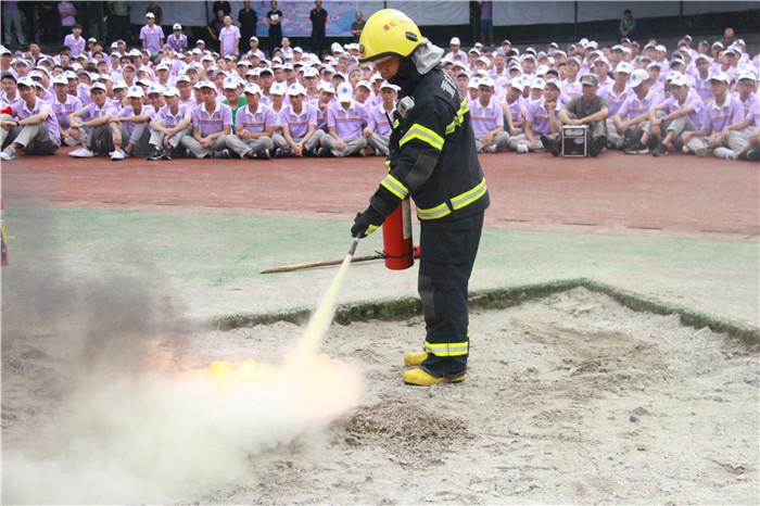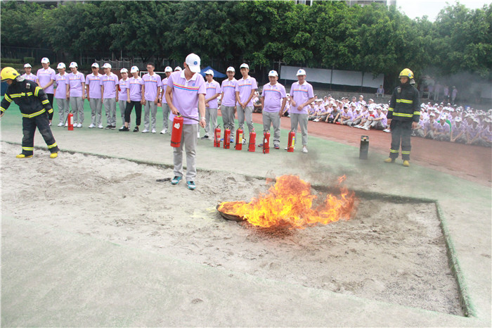 下午3点,演练正式开始。“使用干粉灭火器灭火,应与起火位置保持3米以上距离,使用前,先把灭火器上下颠倒几次,然后拔下保险栓,一只手握住喷嘴,另一只手用力压下压把,对准火焰根部喷射……”南津街中队王玉杰教官在田径运动场上,手把手指导师生们灭火器的正确使用方法以及注意事项,适用的火灾类型,如何检查灭火器是否保持完好有效。随后,在消防官兵的现场演示和指导下,部分学生代表踊跃参与实地灭火体验,足足过了一把消防“瘾”。