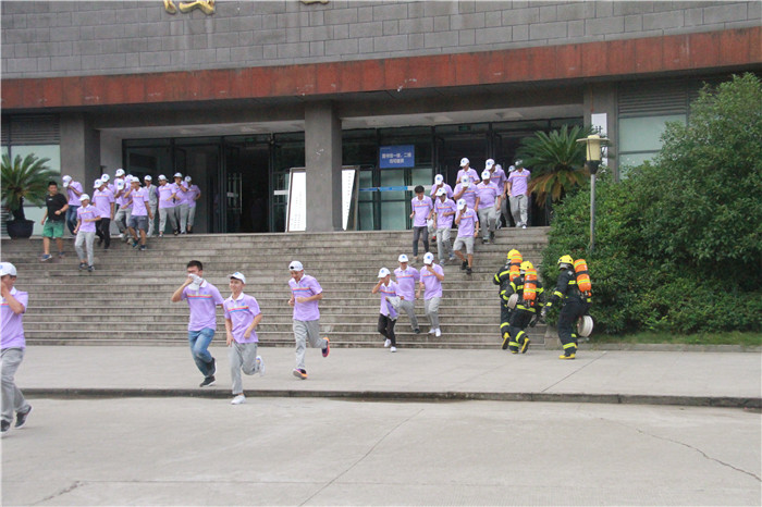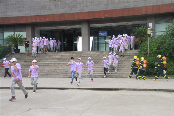 随着一阵急促的警报声,新生在指挥员的引导下,按照火场逃生要领,沿着图书馆疏散通道,用手捂住口鼻,弯腰低姿快速通过各个安全出口撤离到安全地带,整个疏散过程快速有序,展现出了良好的消防安全素质。